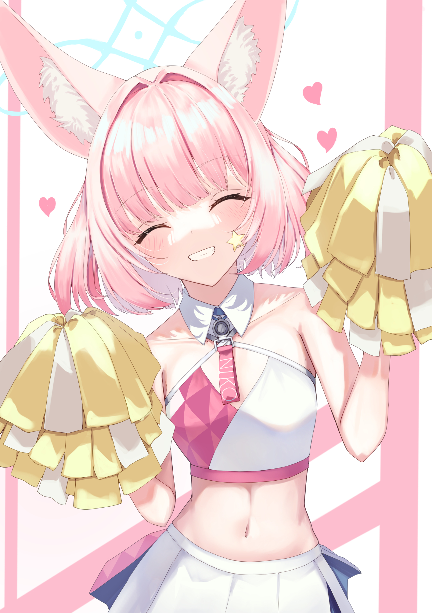 1girl aki_tsune animal_ears blue_archive blush breasts cheering cheerleader closed_eyes criss-cross_halter fox_ears fox_girl halo halterneck heart highres holding holding_pom_poms millennium_cheerleader_outfit_(blue_archive) navel niko_(blue_archive) open_mouth pink_hair pleated_skirt pom_pom_(cheerleading) pom_poms short_hair simple_background skirt small_breasts smile solo sports_bra standing star_(symbol) white_skirt