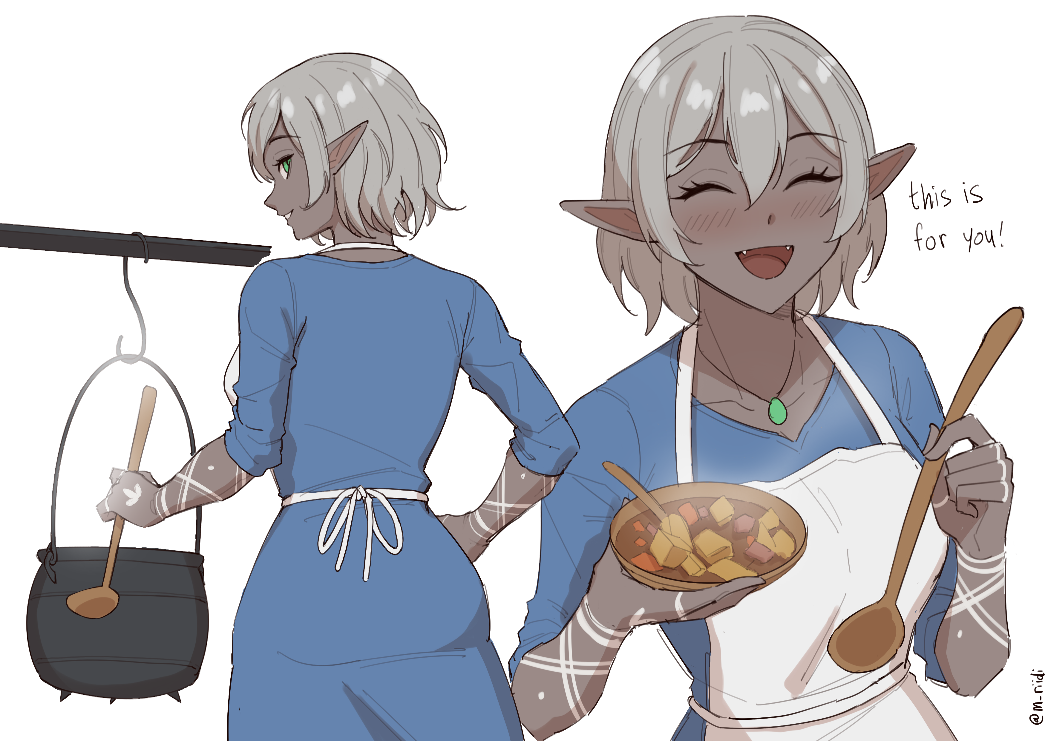 1girl absurdres apron blush bowl cauldron cooking dark-skinned_female dark_elf dark_skin elf english_text food green_eyes grey_hair highres holding holding_bowl holding_ladle jewelry ladle looking_at_viewer looking_back mawaridi milestone_celebration necklace open_mouth original pointy_ears short_hair smile solo spoon stew teeth yvonne_(mawaridi)