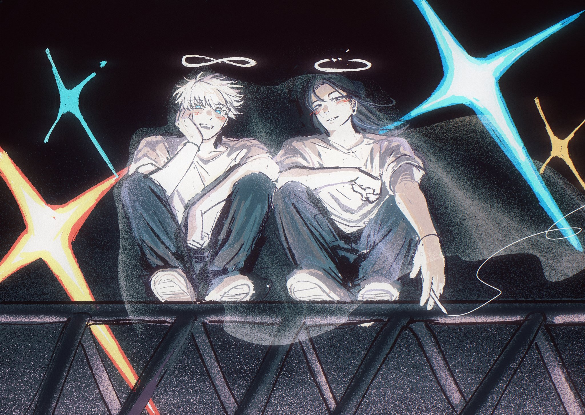 2boys black_background black_eyes black_hair black_pants blue_eyes blush bracelet diffraction_spikes ear_piercing full_body geto_suguru gojo_satoru halo head_rest hebeinai highres infinity_symbol jewelry jujutsu_kaisen long_hair male_focus multiple_boys night open_mouth outdoors pants piercing shirt short_hair short_sleeves smile spoilers squatting white_footwear white_hair white_shirt