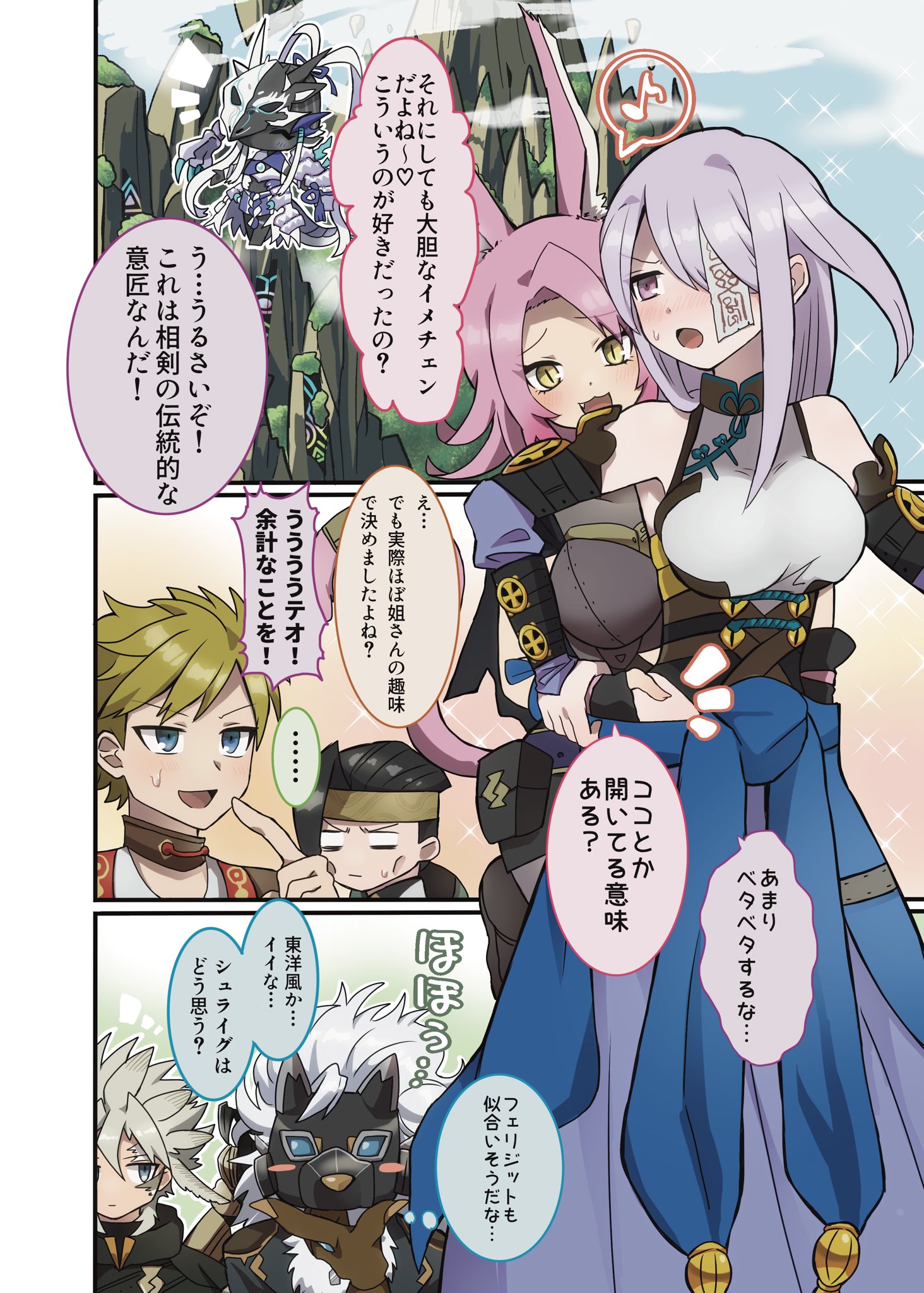 3girls 4boys animal_ears artist_name artist_request behind_another black_bodysuit black_hair blonde_hair blue_eyes blush bodysuit breasts cat_ears cat_girl chibi chinese_clothes covered_eyes covering_privates dialogue_box dragon dragon_girl fleurdelis_(yu-gi-oh!) furry furry_male goggles goggles_on_eyes grey_hair helmet helmet_over_eyes highres japanese_text long_hair mask mask_on_head medium_breasts mountain multiple_boys multiple_girls pink_hair purple_hair swordsoul_(yu-gi-oh!) swordsoul_of_mo_ye tail talisman the_iris_swordsoul translation_request tri-brigade_ferrijit_the_barren_blossom tri-brigade_rugal_the_silver_sheller tri-brigade_shuraig_the_ominous_omen twintails very_long_hair white_hair yellow_eyes yu-gi-oh! yu-gi-oh!_duel_monsters