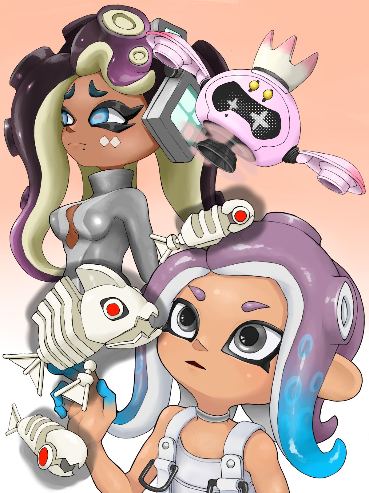 2girls agent_8_(splatoon) bare_shoulders blue_eyes bodysuit breasts dark-skinned_female dark_skin fish highres marina_(splatoon) medium_breasts multiple_girls nintendo octoling robot sheoknight sleeveless splatoon_(series) splatoon_3 splatoon_3:_side_order tentacle_hair