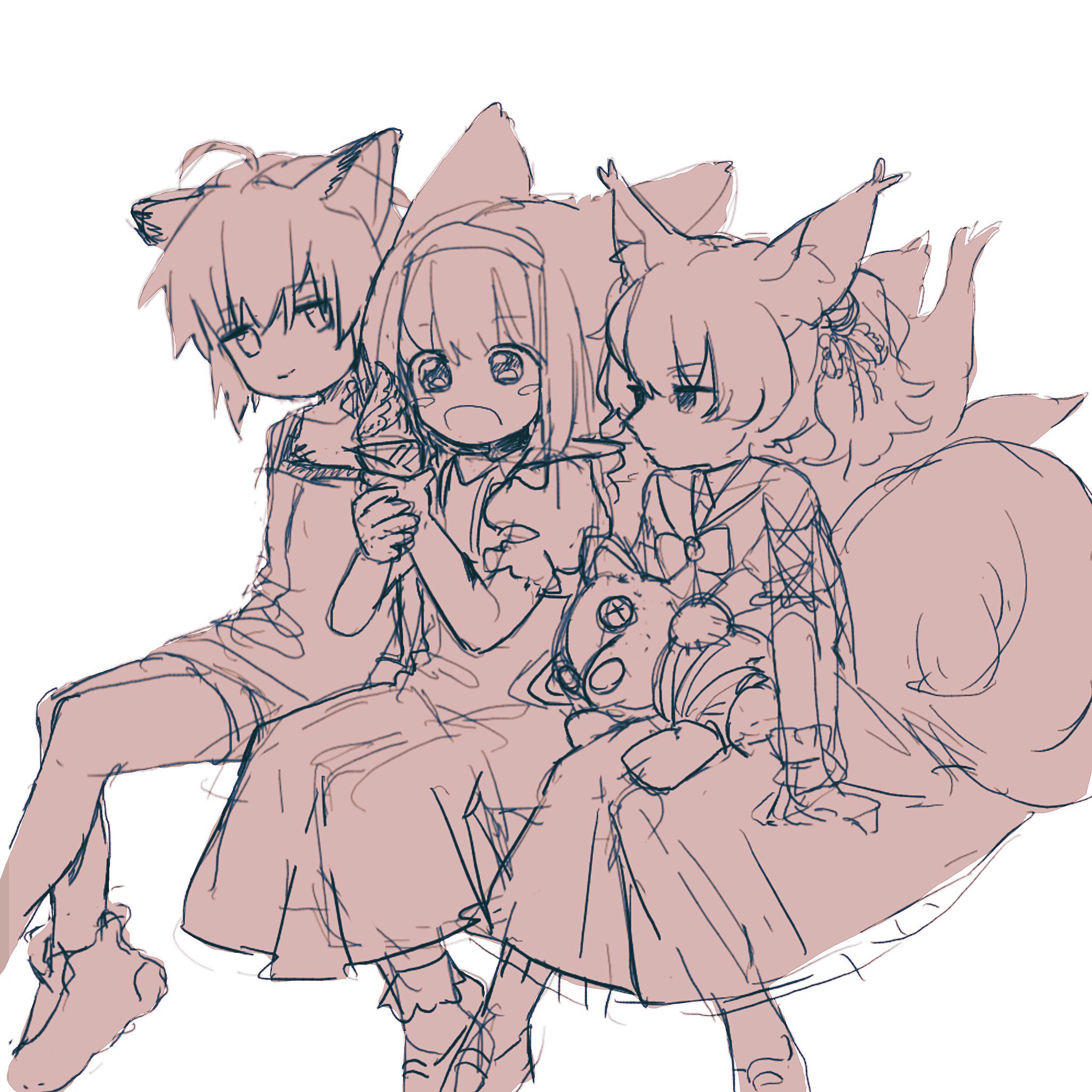 3girls animal_ears arknights closed_mouth dress fox_ears fox_girl fox_tail highres invisible_chair monochrome morte_(arknights) multiple_girls niwatori_(akira_207) open_mouth shamare_(arknights) short_hair simple_background sitting sketch stuffed_wolf sussurro_(arknights) suzuran_(arknights) tail white_background