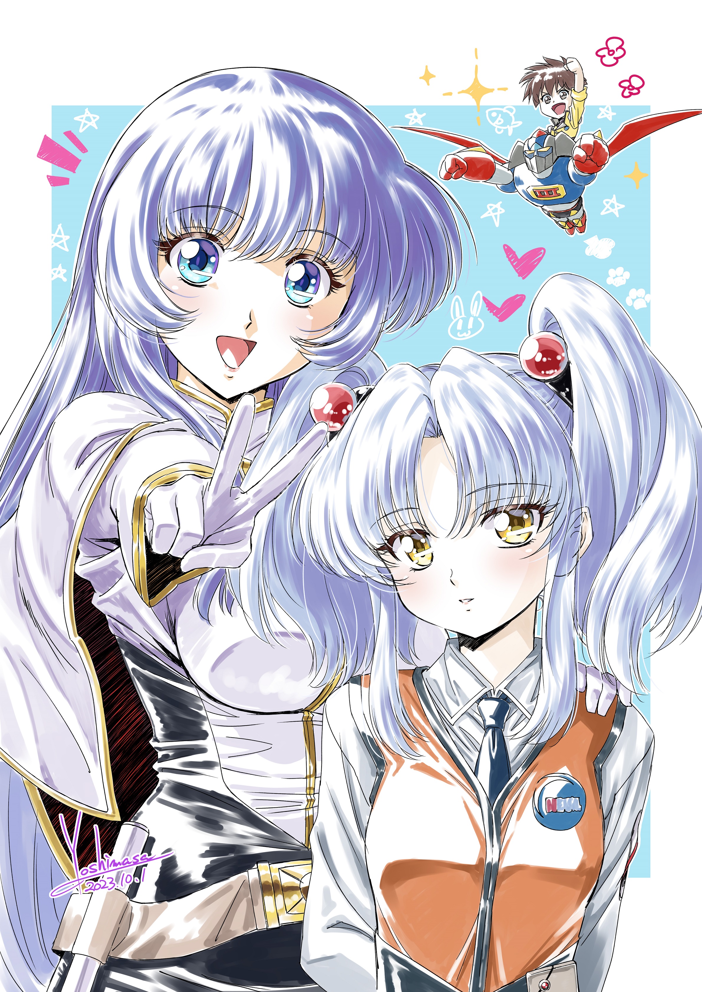 1990s_(style) 2girls absurdres belt blue_eyes blue_hair gekiganger_3 gekiganger_3_(mecha) hair_bobbles hair_ornament highres hoshino_ruri kidou_senkan_nadesico long_hair looking_at_viewer mecha misumaru_yurika multiple_girls orange_vest pencil_skirt retro_artstyle robot skirt sphere_hair_ornament super_robot tenkawa_akito twintails uniform vest white_hair yellow_eyes yoshinaga_masahiro