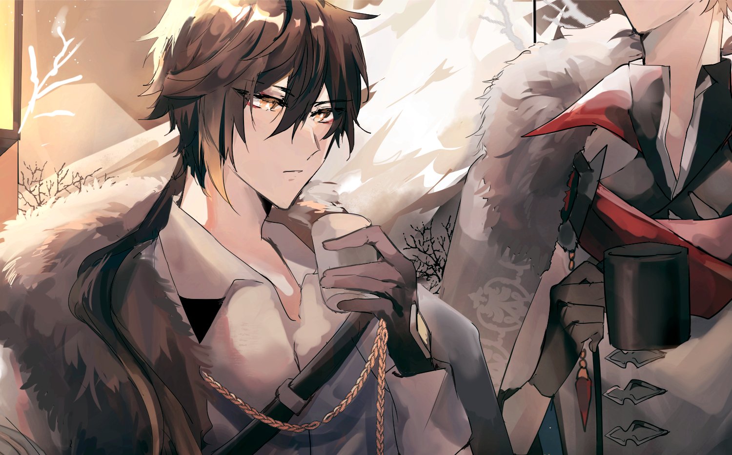 2boys coat cup efu_(angelschatedral99) fur_trim genshin_impact holding holding_cup male_focus multiple_boys tartaglia_(genshin_impact) zhongli_(genshin_impact)