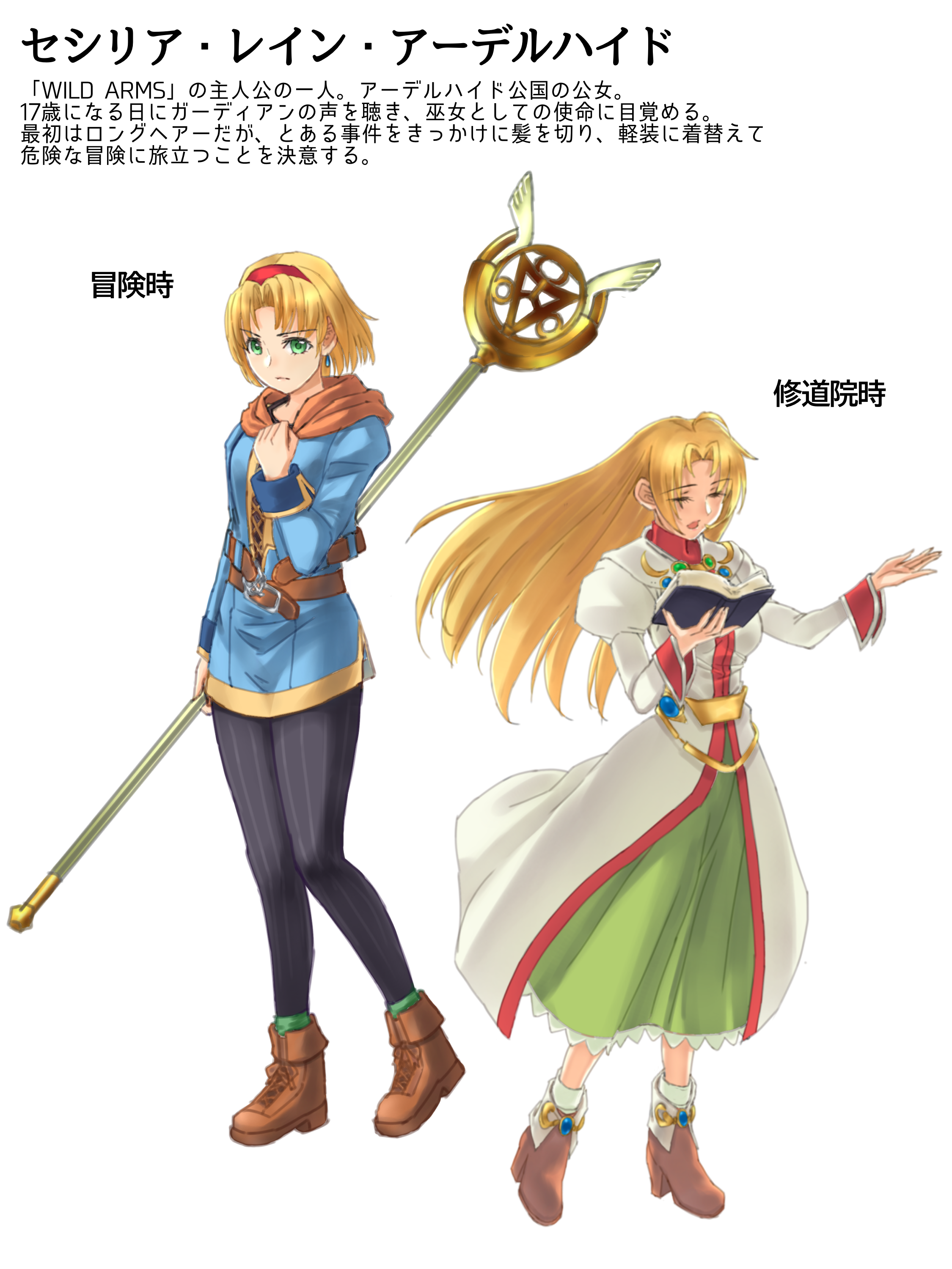 1girl absurdres blonde_hair book breasts brown_footwear cecilia_lynne_adelhyde closed_eyes closed_mouth dress dual_persona full_body highres inonakakawaz long_hair looking_at_viewer medium_breasts open_mouth short_hair simple_background solo white_background wild_arms wild_arms_1