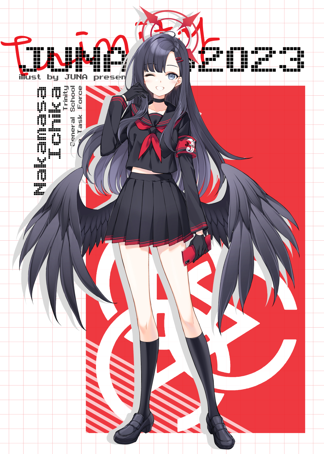 1girl armband black_choker black_gloves black_hair black_sailor_collar black_serafuku black_shoes black_socks blue_archive blush cellphone character_name choker full_body gloves grey_eyes grin hair_ornament hairclip halo highres holding holding_phone ichika_(blue_archive) juna kneehighs long_hair long_sleeves looking_at_viewer neckerchief one_eye_closed phone red_armband red_halo red_neckerchief sailor_collar school_uniform serafuku shoes smartphone smile socks solo unusually_open_eyes