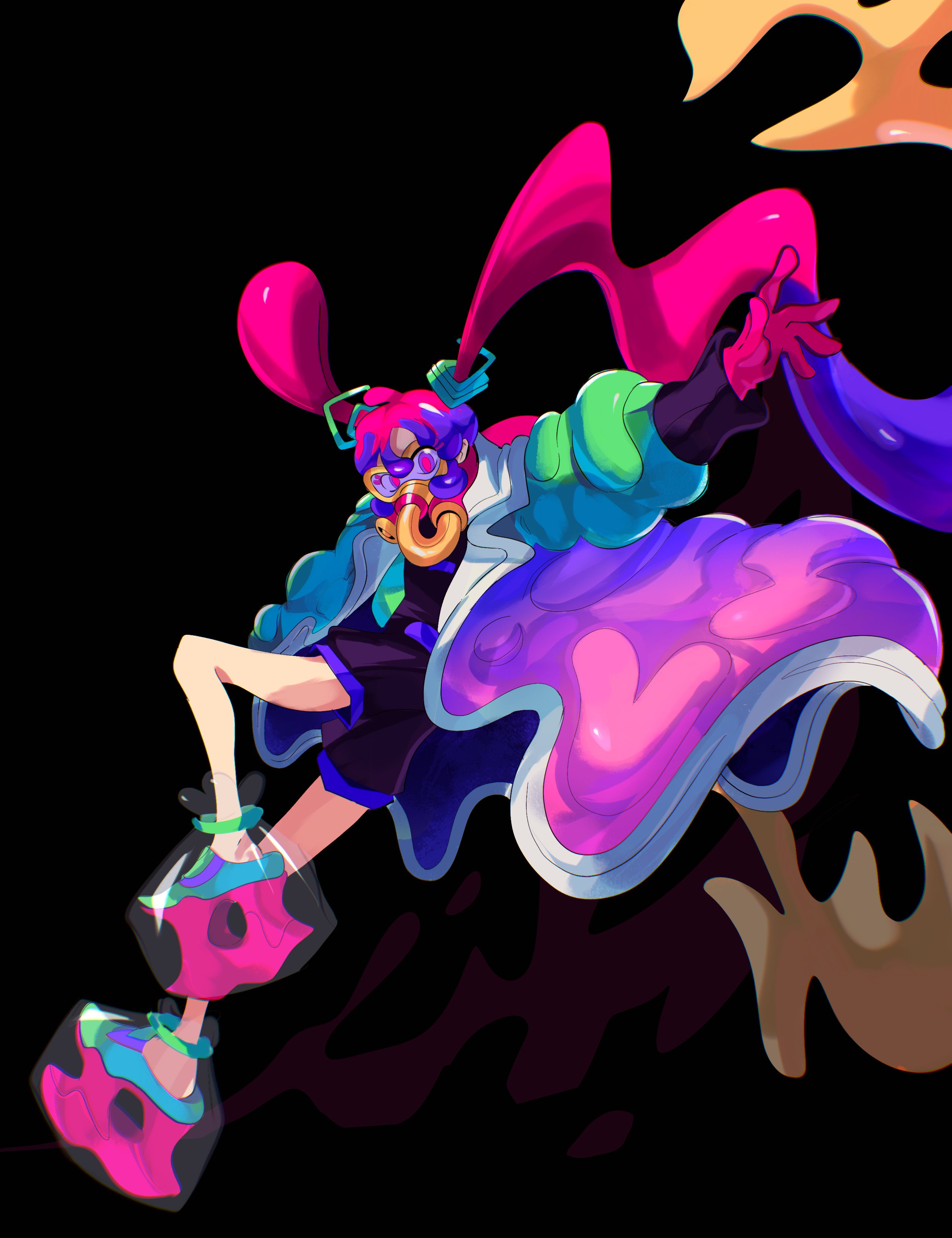 1girl absurdres black_background coat floating_hair full_body gloves goggles green_necktie hatsune_miku highres leg_up long_hair long_sleeves looking_at_viewer marnie_(marnielovesyou) mixed-language_commentary multicolored_hair necktie nintendo open_clothes open_coat overall_shorts overalls pink_gloves pink_hair pink_pupils platform_shoes poison_miku_(project_voltage) pokemon project_voltage purple_coat purple_eyes shoes simple_background solo twintails very_long_hair vocaloid