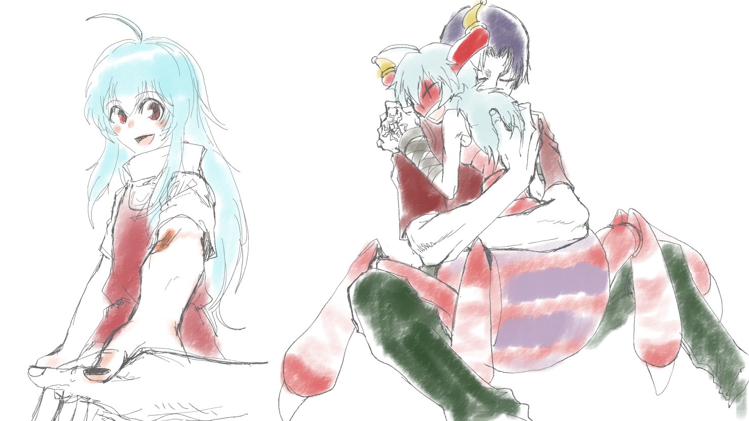 archnemon blue_hair bug digimon digimon_(creature) holding_hands horns insect_girl long_hair mask monster_girl oikawa_yukio open_mouth spider spider_girl