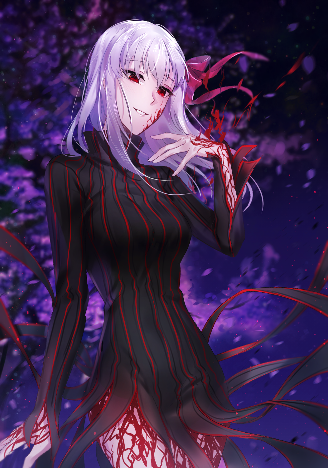 1girl black_dress blood blush body_markings breasts corruption dark_persona dark_sakura dress fate/stay_night fate_(series) hair_ribbon heaven's_feel highres large_breasts light_particles light_purple_hair long_sleeves matou_sakura muneomon_(takomon) night petals red_eyes ribbon smile solo striped_clothes striped_dress teeth tree turtleneck vertical-striped_clothes vertical-striped_dress white_hair