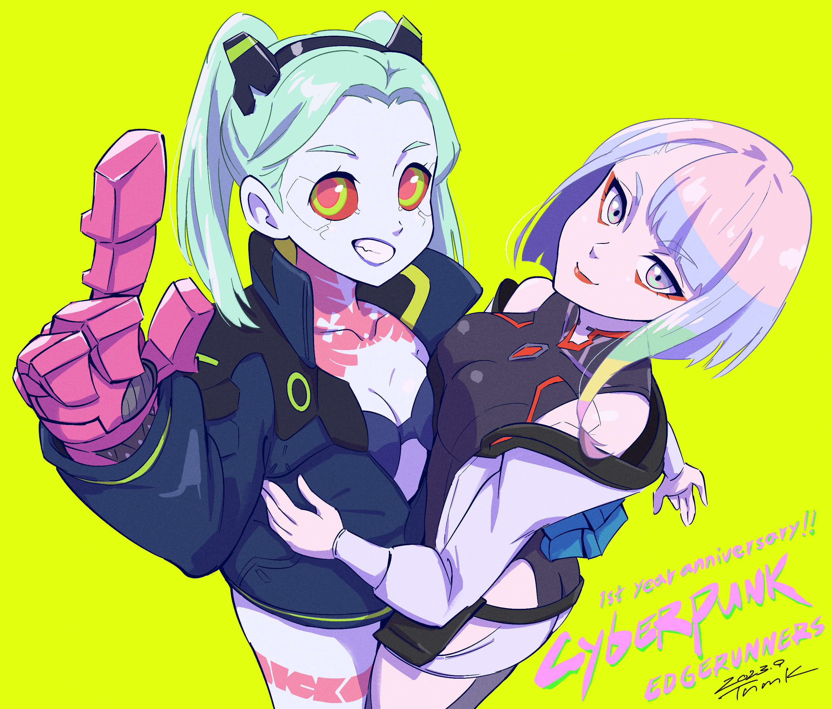2023 2girls anniversary ass black_jacket bra breasts breasts_squeezed_together colored_skin cyberpunk_(series) cyberpunk:_edgerunners dated english_text female_focus green_background grin happy highres hug jacket leg_tattoo leotard leotard_under_clothes lips lipstick long_hair looking_at_viewer lucy_(cyberpunk) makeup mechanical_arms medium_breasts multiple_girls neck_tattoo open_mouth pink_tattoo rebecca_(cyberpunk) samurai_jacket_(cyberpunk) short_hair simple_background small_breasts smile standing tattoo tsunemoku twintails underwear white_hair white_skin yellow_background
