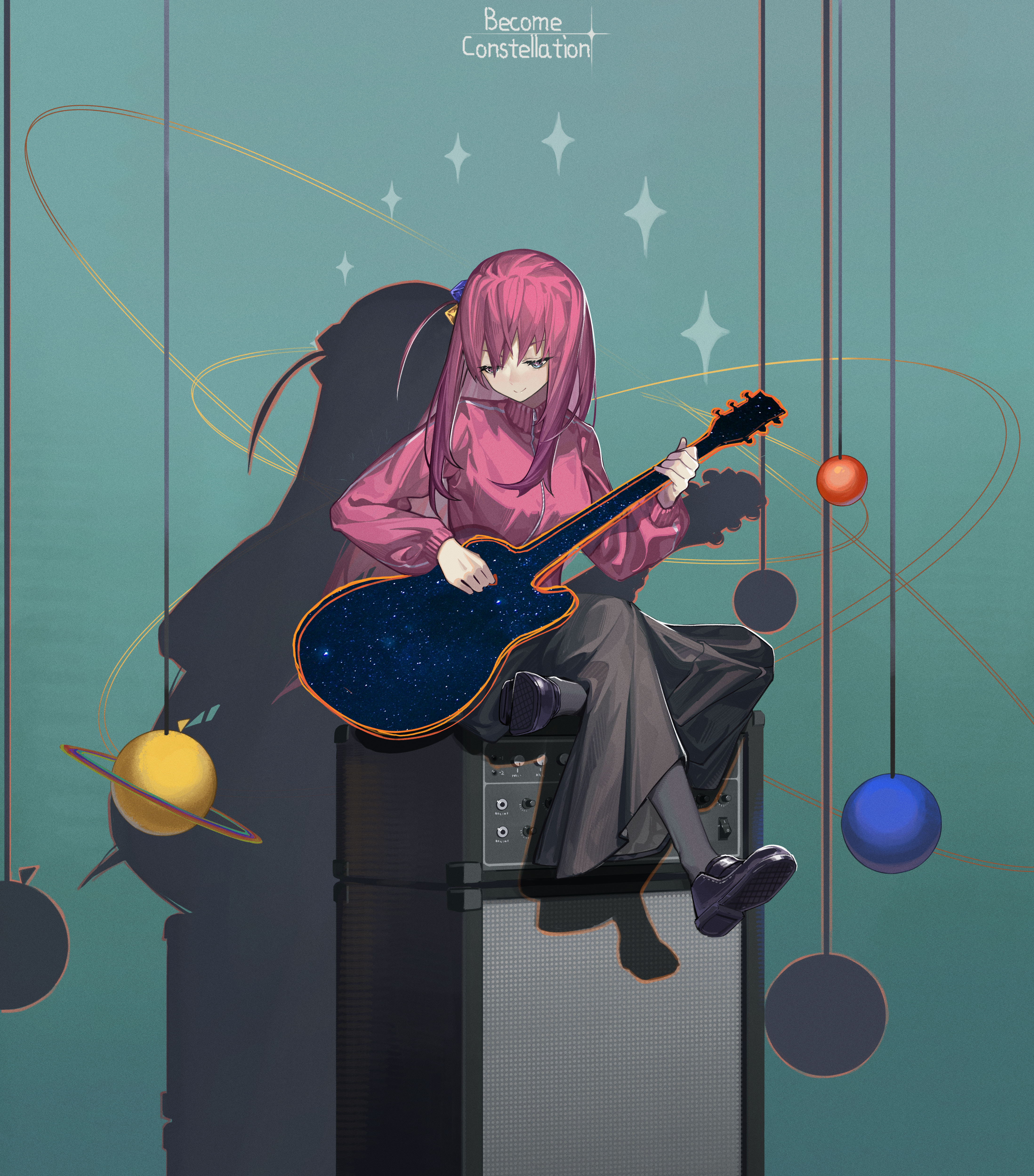 1girl absurdres black_shoes black_skirt bocchi_the_rock! breasts closed_mouth commentary_request cube_hair_ornament double_exposure electric_guitar english_text gotoh_hitori grey_pantyhose guitar hair_between_eyes hair_ornament half-closed_eyes highres holding holding_instrument instrument jacket loafers long_hair long_sleeves medium_breasts mo_ying_yu one_side_up pantyhose pink_hair pink_jacket planet planetary_ring plectrum puffy_long_sleeves puffy_sleeves purple_eyes shoes sitting skirt smile solo space star_(sky) track_jacket very_long_hair