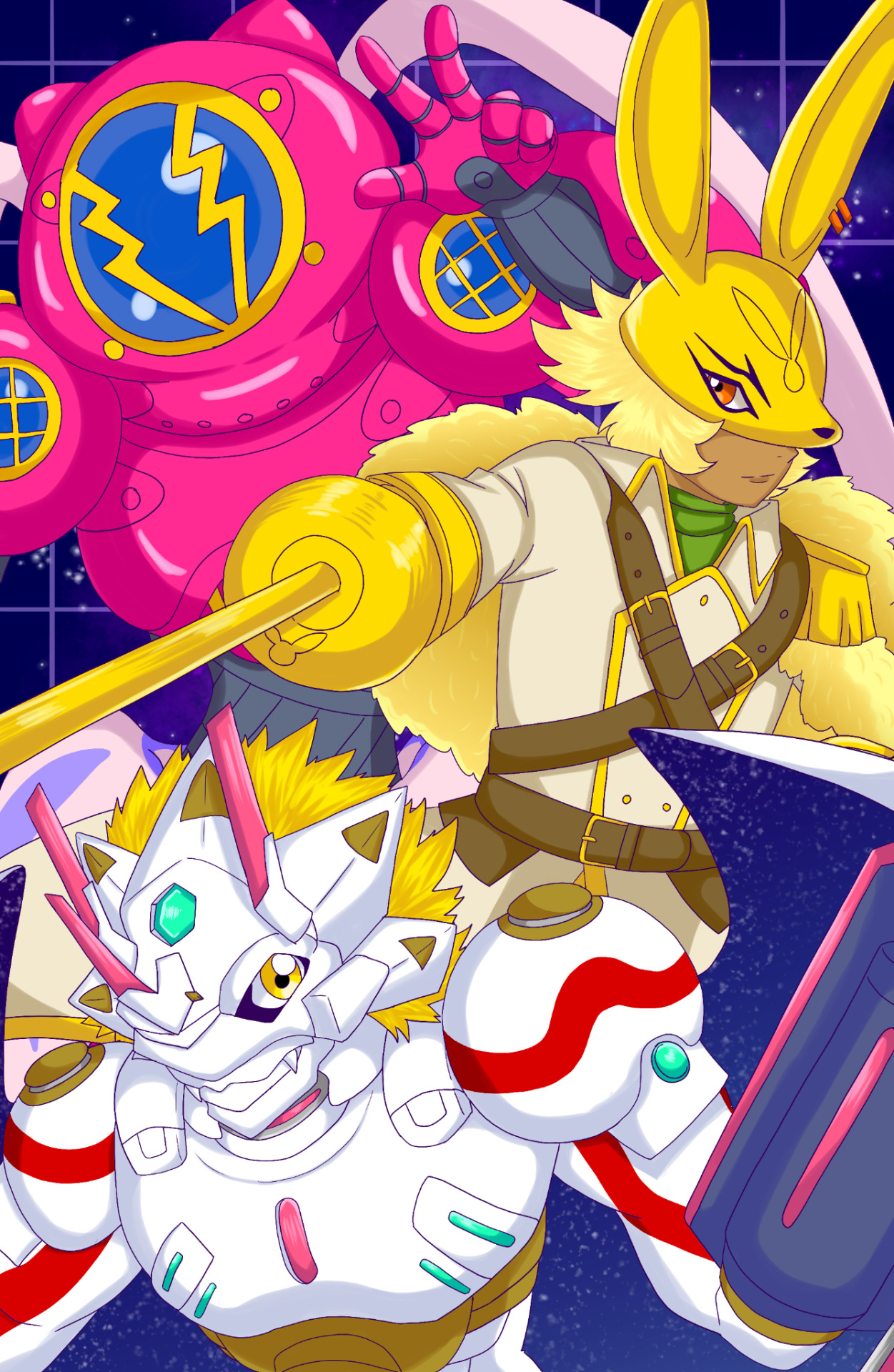 amphimon android armor diarbbitmon digimon digimon_(creature) diving_suit dragon_boy full_armor gynoid highres mask mecha_girl rabbit_mask robot_girl siriusmon
