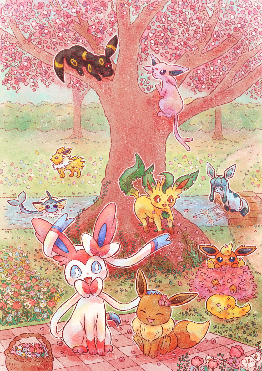 animal_focus black_eyes blanket blue_eyes bridge bright_pupils brown_eyes closed_eyes eevee espeon flareon flower flower_basket forehead_jewel gen_1_pokemon gen_2_pokemon gen_4_pokemon gen_6_pokemon glaceon highres in_tree jolteon kuruta_(qulta03) leafeon nintendo no_humans one_eye_closed open_mouth partially_submerged path petals picnic pink_flower pokemon pokemon_(creature) red_eyes reflection reflective_liquid road smile spring_(season) sylveon tree umbreon under_tree vaporeon white_flower white_pupils