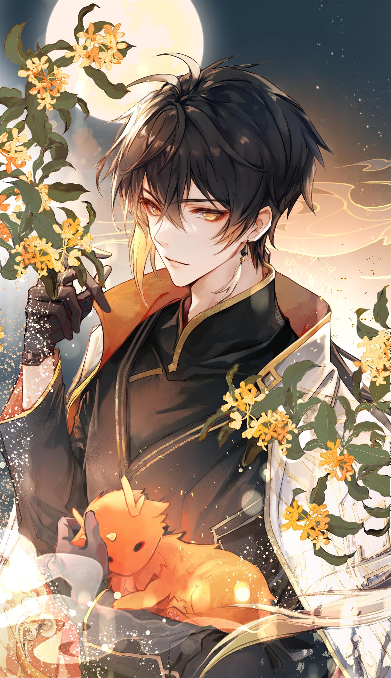 1boy antenna_hair black_gloves black_hair black_shirt black_sky blonde_hair chinese_clothes chrysos_milk closed_eyes closed_mouth cloud crystal_hair_ornament dragon dragon_horns dragon_tail earrings eyeshadow flower genshin_impact gloves gradient_hair hair_between_eyes hair_ornament hand_up highres horns jacket jewelry leaf long_hair long_sleeves looking_at_viewer low_ponytail makeup male_focus mandarin_collar moon multicolored_hair night no_mouth open_clothes open_jacket orange_eyes orange_flower orange_fur outdoors ponytail red_eyeshadow rex_lapis_(genshin_impact) shirt single_earring sky smile standing tail tassel tassel_earrings white_jacket yellow_flower zhongli_(genshin_impact)