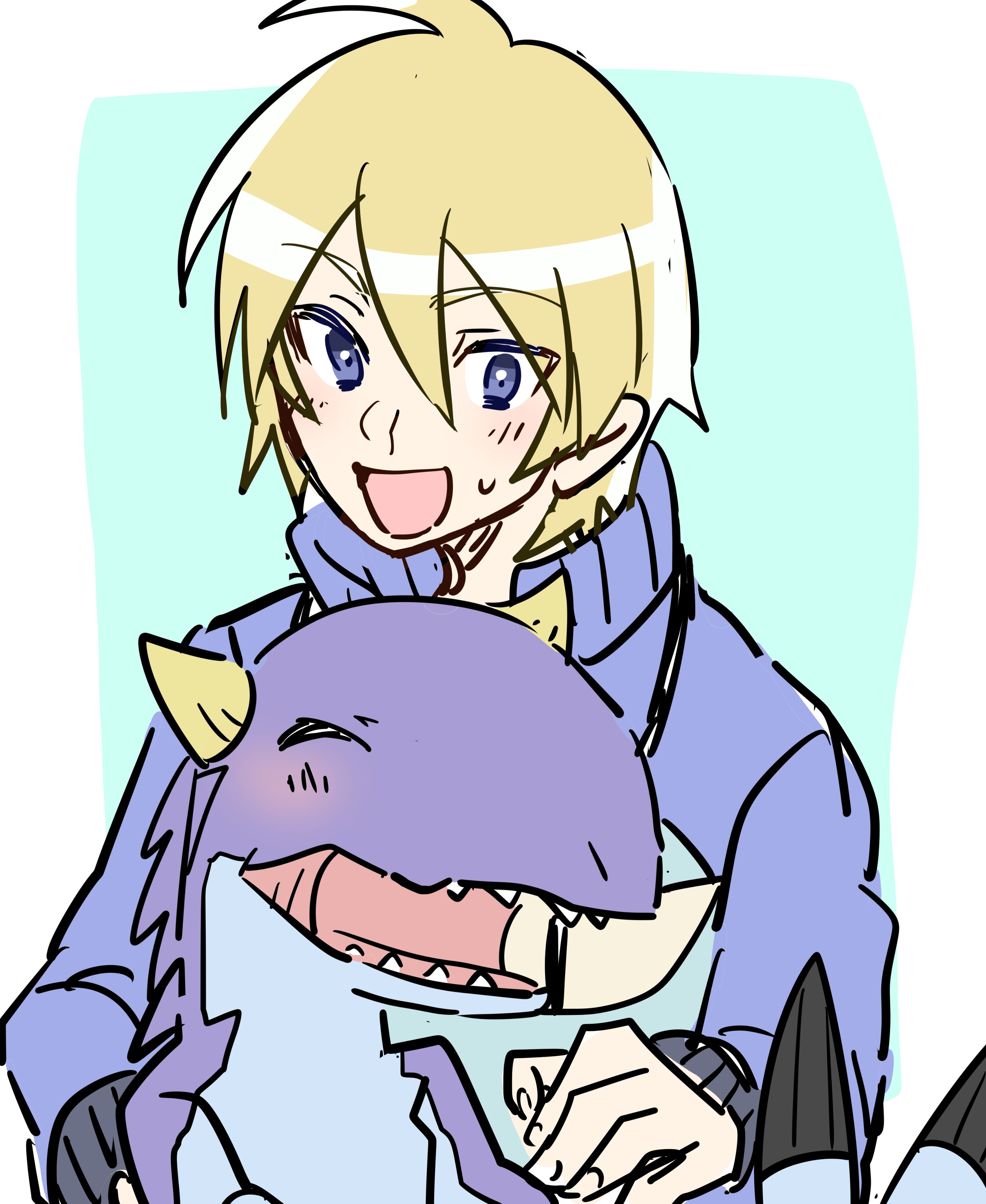 absurdres ace_(dinosaur_king) blonde_hair blue_eyes blush dinosaur dinosaur_king highres horns open_mouth rex_owen sharp_teeth teeth