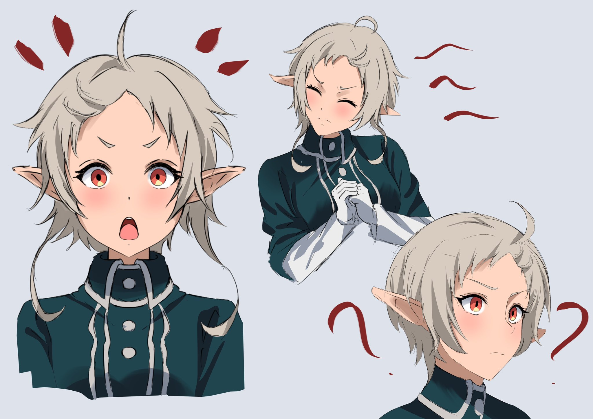 1girl ? ahoge cloak closed_eyes closed_mouth elf gloves green_cloak grey_hair highres multiple_views mushoku_tensei pointy_ears quelsstone red_eyes short_hair sylphiette_(mushoku_tensei) white_gloves