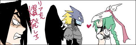 armor beelzebumon braid breasts digimon digimon_(creature) helmet japanese_text lilithmon long_hair looking_at_another medium_breasts mervamon translation_request