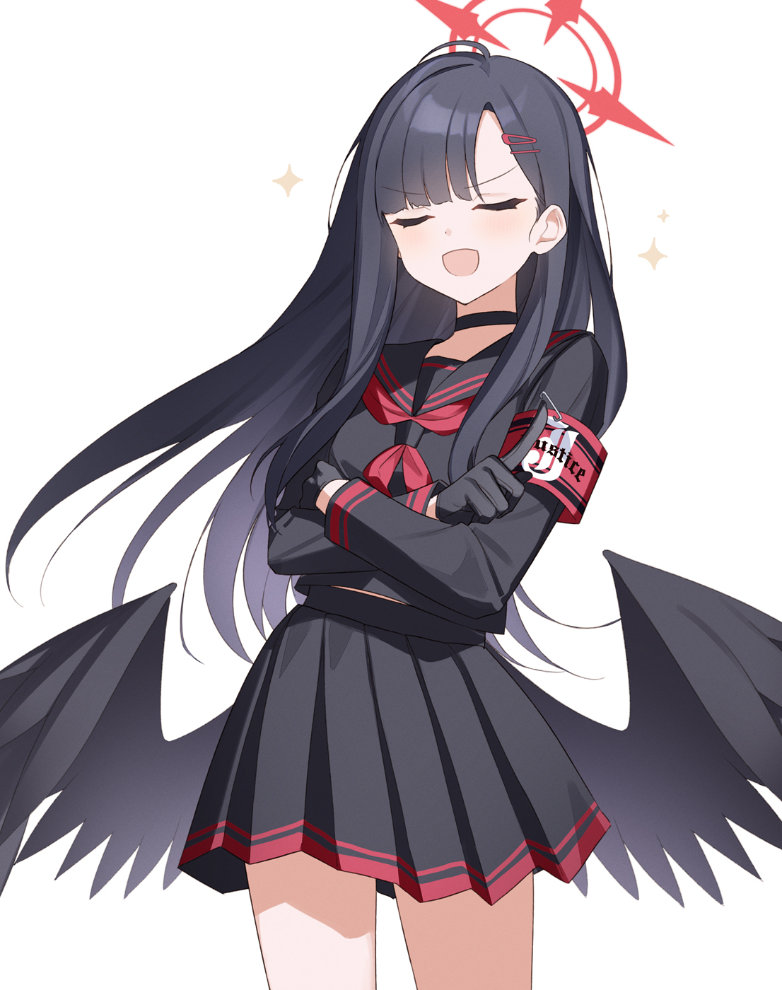 1girl armband black_choker black_gloves black_hair black_sailor_collar black_serafuku black_skirt black_wings blue_archive choker closed_eyes commentary_request cowboy_shot feathered_wings gloves hair_ornament hairclip halo highres ichika_(blue_archive) long_hair midriff_peek neckerchief nekoln open_mouth pleated_skirt red_armband red_halo red_neckerchief safety_pin sailor_collar school_uniform serafuku simple_background skirt smile solo white_background wings