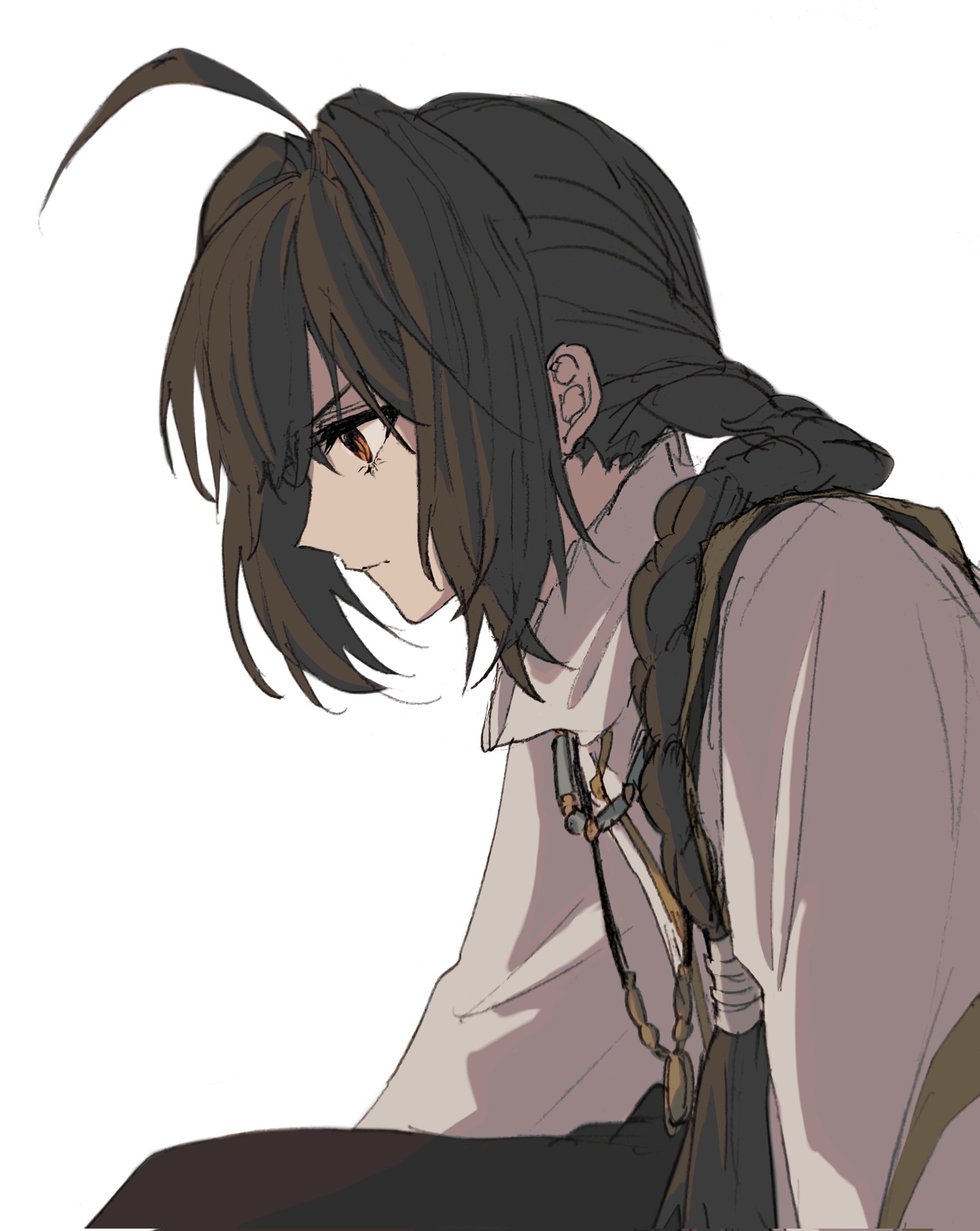 1other ahoge androgynous black_hair black_pants braid braided_ponytail brown_eyes closed_mouth commentary corrupted_twitter_file fate/samurai_remnant fate_(series) from_side hair_intakes highres japanese_clothes jewelry long_hair necklace pants profile saber_(fate/samurai_remnant) simple_background solo white_background yumeko_(fgo39625963)