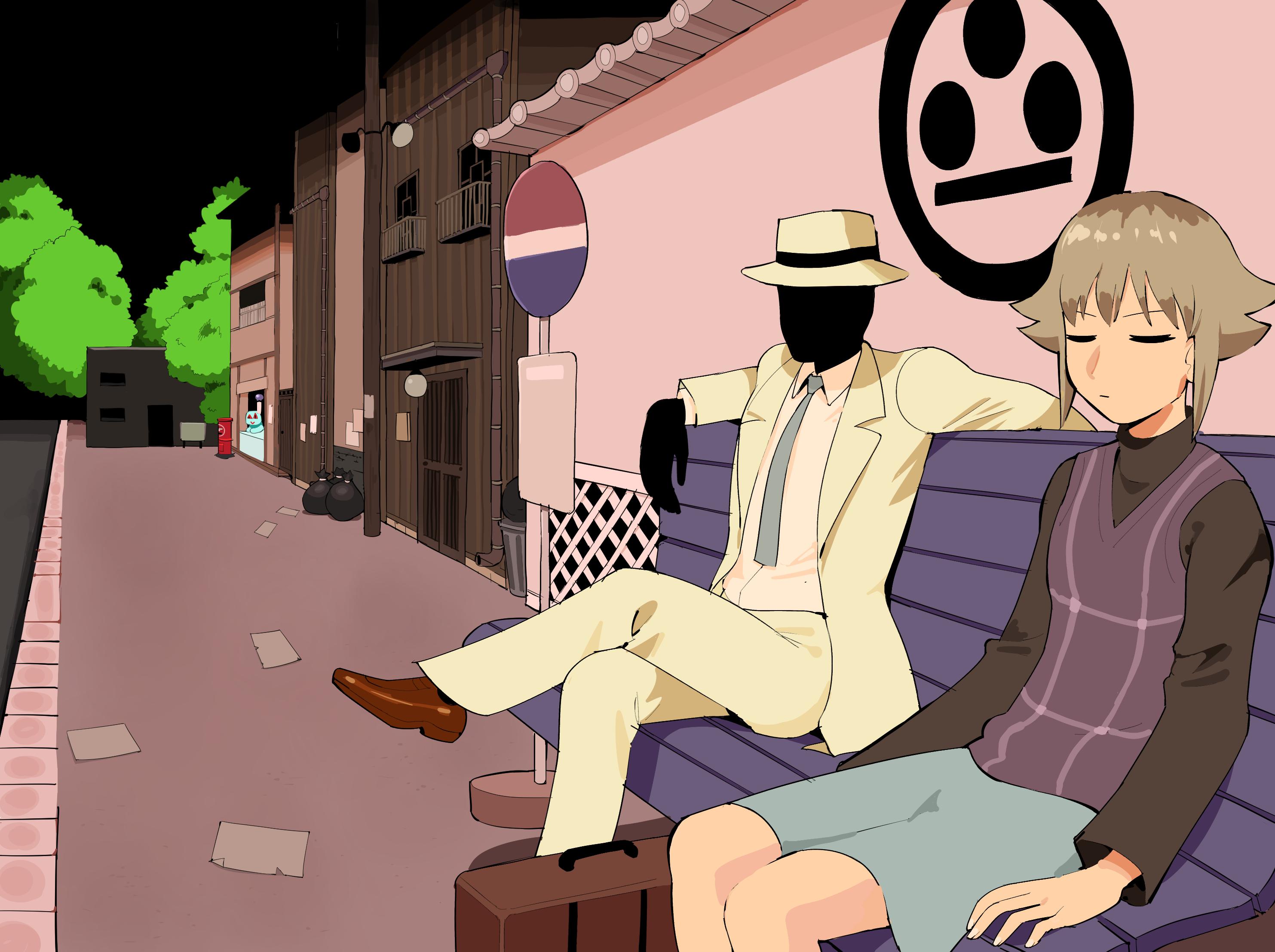 1boy 1girl 1other arm_rest arm_up arms_at_sides bench black_skin black_sky black_sweater blonde_hair blue_necktie blue_skirt brown_footwear building closed_eyes closed_mouth collared_shirt colored_skin commentary creature crossed_legs door doorway dress_shoes expressionless faceless faceless_male fedora feet_out_of_frame fingernails flipped_hair from_side giganticbuddha hat highres horizon jacket japanese_cylindrical_postbox knees lamppost lead_pipe leaning_back leg_up light_bulb long_sleeves medium_hair necktie outdoors pants paper perspective purple_vest raised_curb road shirt shoes sidelocks sign sitting skirt sky street sweater tile_roof trash_bag trash_can tree trellis turtleneck turtleneck_sweater urotsuki v-shaped_eyebrows vanishing_point vest white_shirt window yellow_headwear yellow_jacket yellow_pants yume_2kki