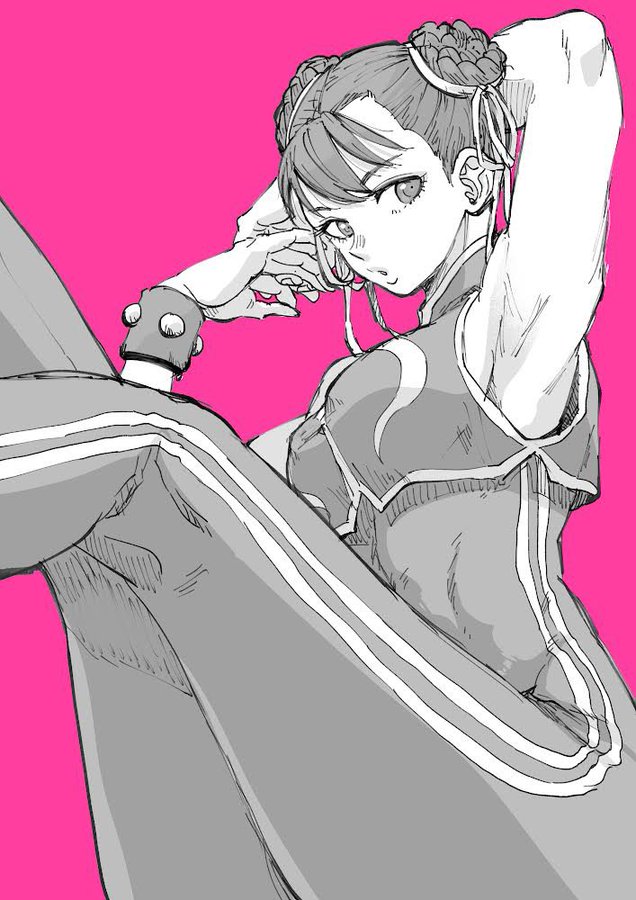 1girl arm_up armpits bracelet capcom chun-li double_bun hair_bun hair_ribbon jewelry monochrome own_hands_together ribbon simple_background sitting street_fighter takafumi unfinished