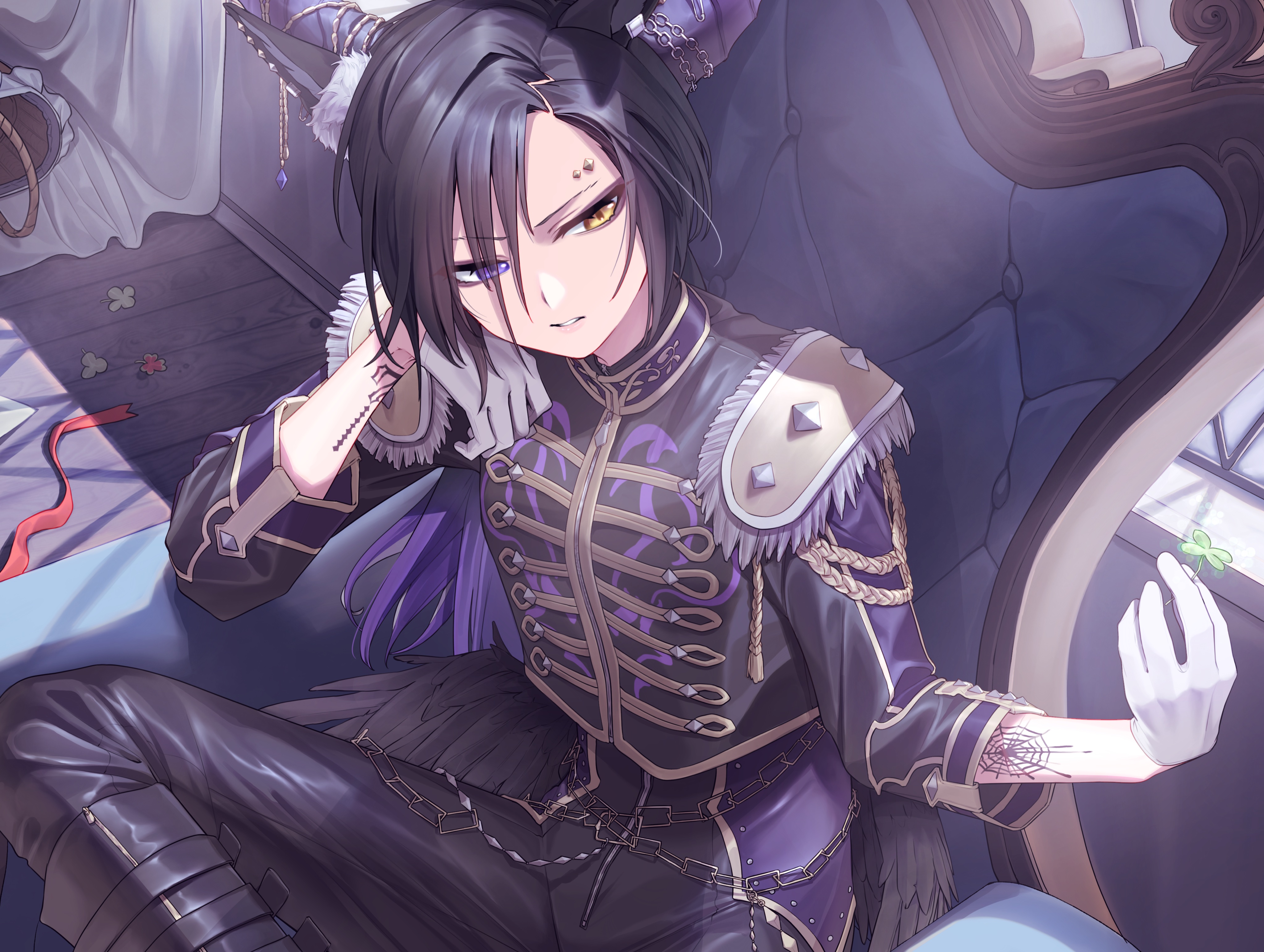 1girl absurdres air_shakur_(belphegor's_prime)_(umamusume) air_shakur_(umamusume) animal_ears arm_tattoo armchair asymmetrical_bangs black_boots black_hair black_jacket black_pants boots breasts chain chair clover commentary ear_covers english_commentary epaulettes eyebrow_piercing face_piercing feathered_wings figure_four_sitting four-leaf_clover gloves half-closed_eyes heterochromia highres holding holding_clover horse_ears indoors jacket long_hair long_sleeves looking_to_the_side low_wings multicolored_hair pants parted_lips piercing purple_eyes purple_hair single_ear_cover sitting small_breasts solo tamayume tattoo two-tone_hair umamusume v-shaped_eyebrows white_gloves wings yellow_eyes