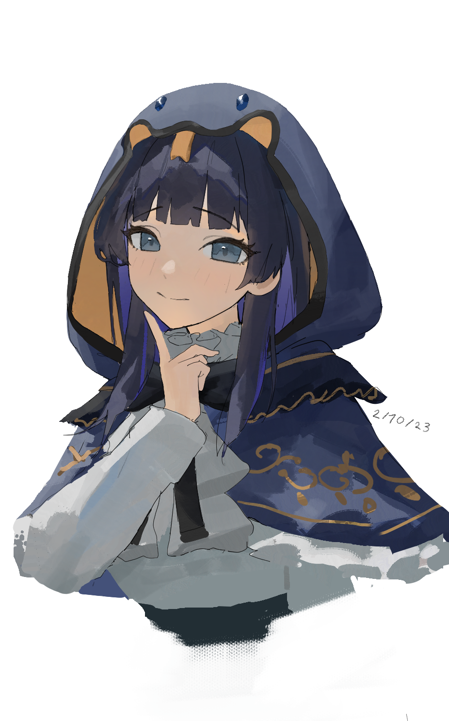 1girl arch_05x blue_capelet blue_eyes blue_hair blunt_bangs breasts capelet colored_inner_hair dated hair_intakes highres hololive hololive_english hood long_hair long_sleeves looking_at_viewer medium_breasts multicolored_hair official_alternate_costume ouro_kronii shirt simple_background smile snake_hood solo teeth turtleneck two-tone_hair virtual_youtuber white_background white_shirt
