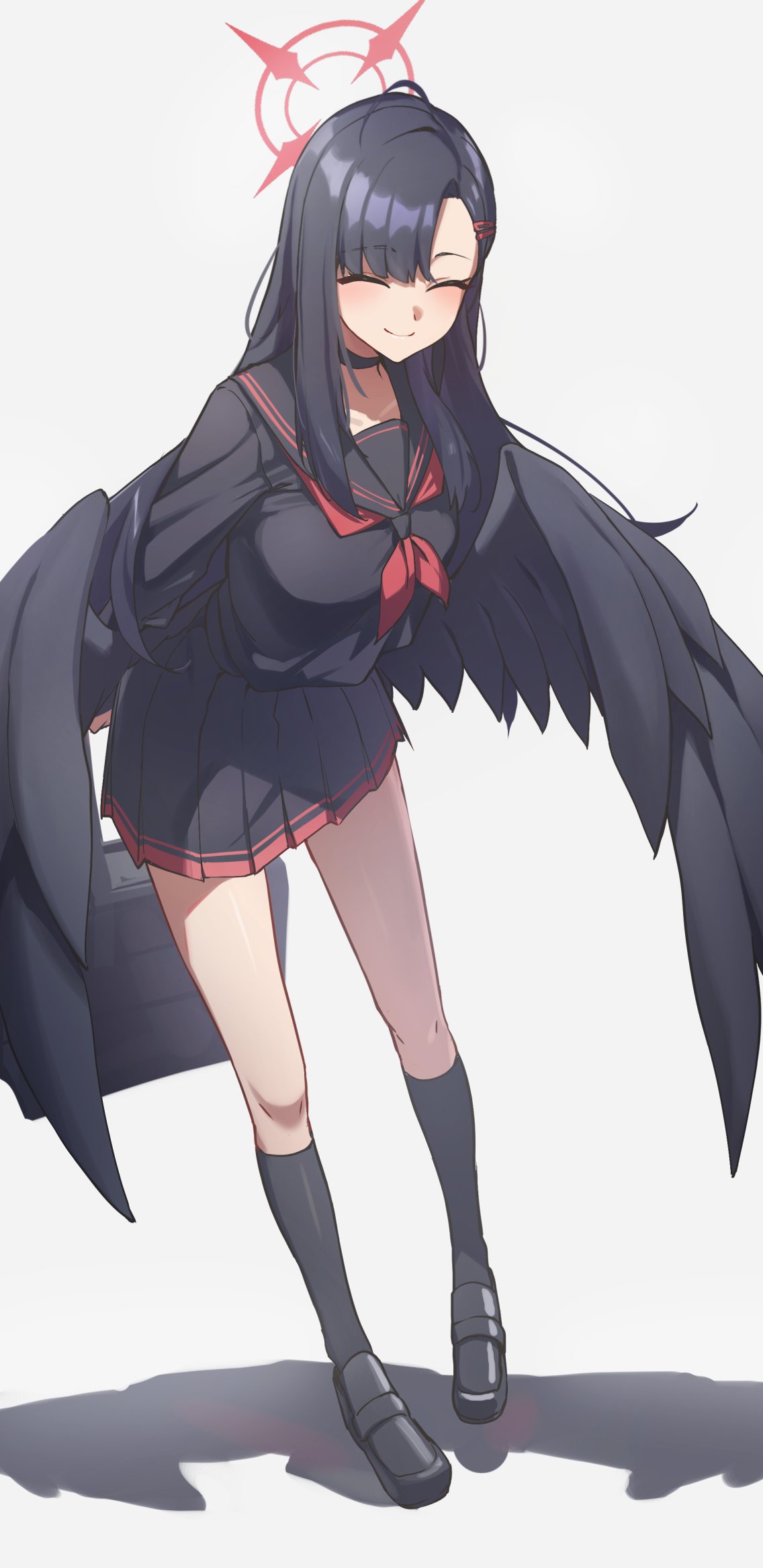 1girl ^_^ arms_behind_back black_choker black_footwear black_hair black_sailor_collar black_serafuku black_shirt black_skirt black_socks black_wings blue_archive blush choker closed_eyes closed_mouth feathered_wings full_body hair_ornament hairclip halo highres ichika_(blue_archive) leaning_forward long_hair low_wings miniskirt neckerchief parted_bangs pleated_skirt red_halo red_neckerchief reulem sailor_collar school_uniform serafuku shirt simple_background skirt smile socks solo standing white_background wings