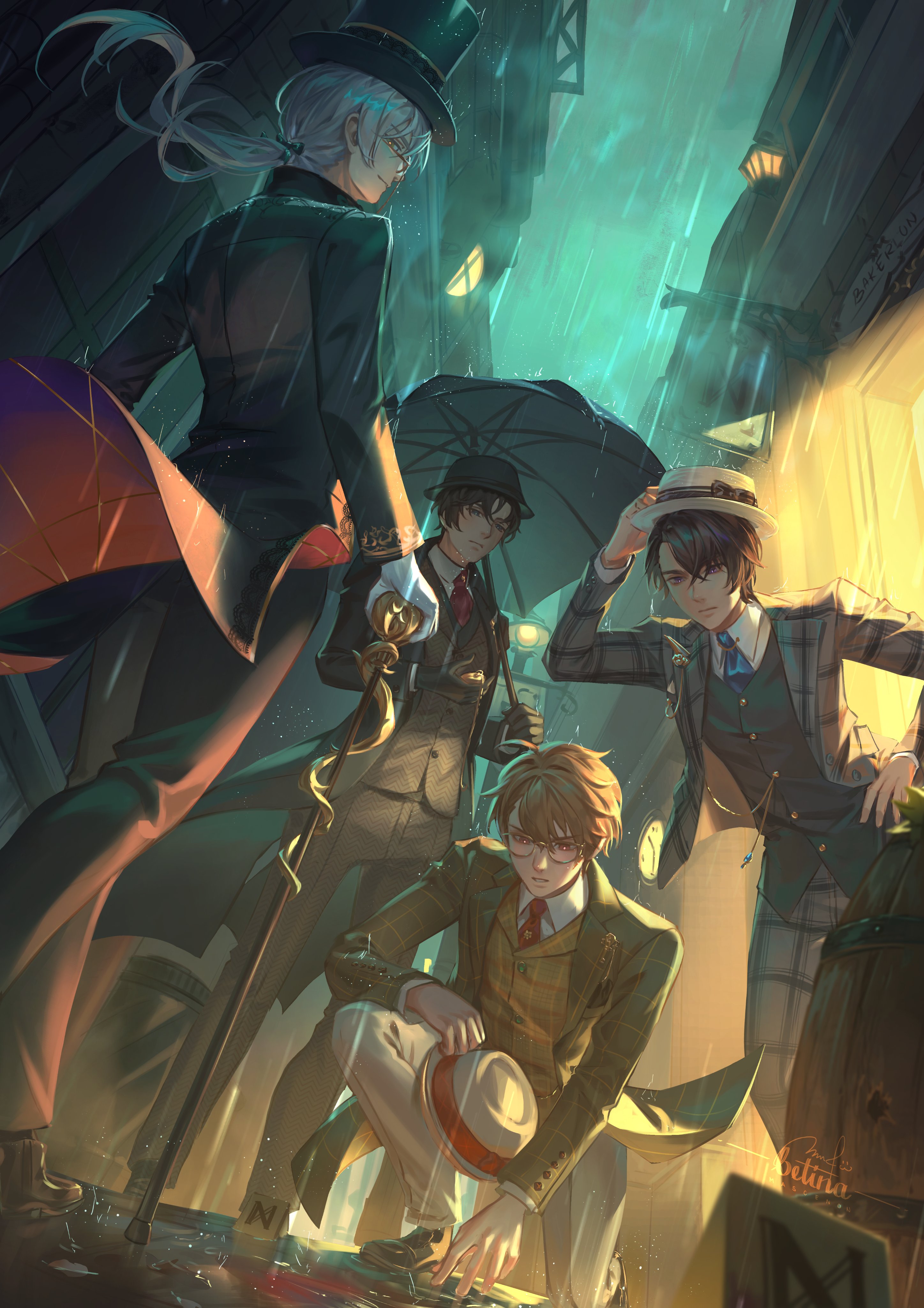 4boys absurdres arm_up artem_wing_(tears_of_themis) betina_mascenon black_footwear black_hair black_headwear black_jacket black_pants black_umbrella black_vest blue_necktie brown_hair brown_jacket brown_pants brown_vest closed_mouth collared_shirt commentary_request floating_hair glasses gloves green_jacket grey_hair grey_jacket grey_pants hair_between_eyes hand_on_own_hip hat highres holding holding_umbrella jacket long_hair luke_pearce_(tears_of_themis) male_focus marius_von_hagen_(tears_of_themis) multiple_boys necktie outdoors pants rain red_eyes shirt shoes tears_of_themis umbrella vest vyn_richter_(tears_of_themis) wall_lamp white_gloves white_headwear white_shirt