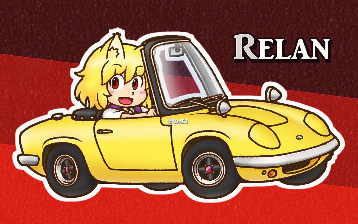 1girl :d animal_ear_fluff animal_ears blonde_hair blush car chibi convertible cookie_(touhou) driving fang fox_ears fox_girl full_body hair_between_eyes looking_at_viewer lotus_elan mgrm_ysnr miramikaru_riran motor_vehicle name_connection open_mouth red_background red_eyes shirt short_hair short_sleeves smile solo upper_body white_shirt