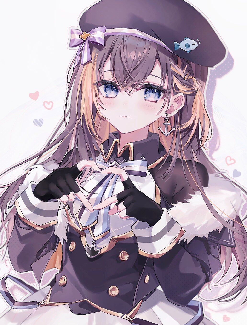 1girl anchor_earrings beret black_gloves black_hair black_hat blue_eyes collared_dress commentary dress earrings fingerless_gloves gloves hat heart heart_hands highres jewelry long_hair multicolored_hair n4o_b nijisanji nijisanji_en official_alternate_costume orange_hair petra_gurin petra_gurin_(2nd_costume) single_earring solo streaked_hair untranslatable_commentary virtual_youtuber