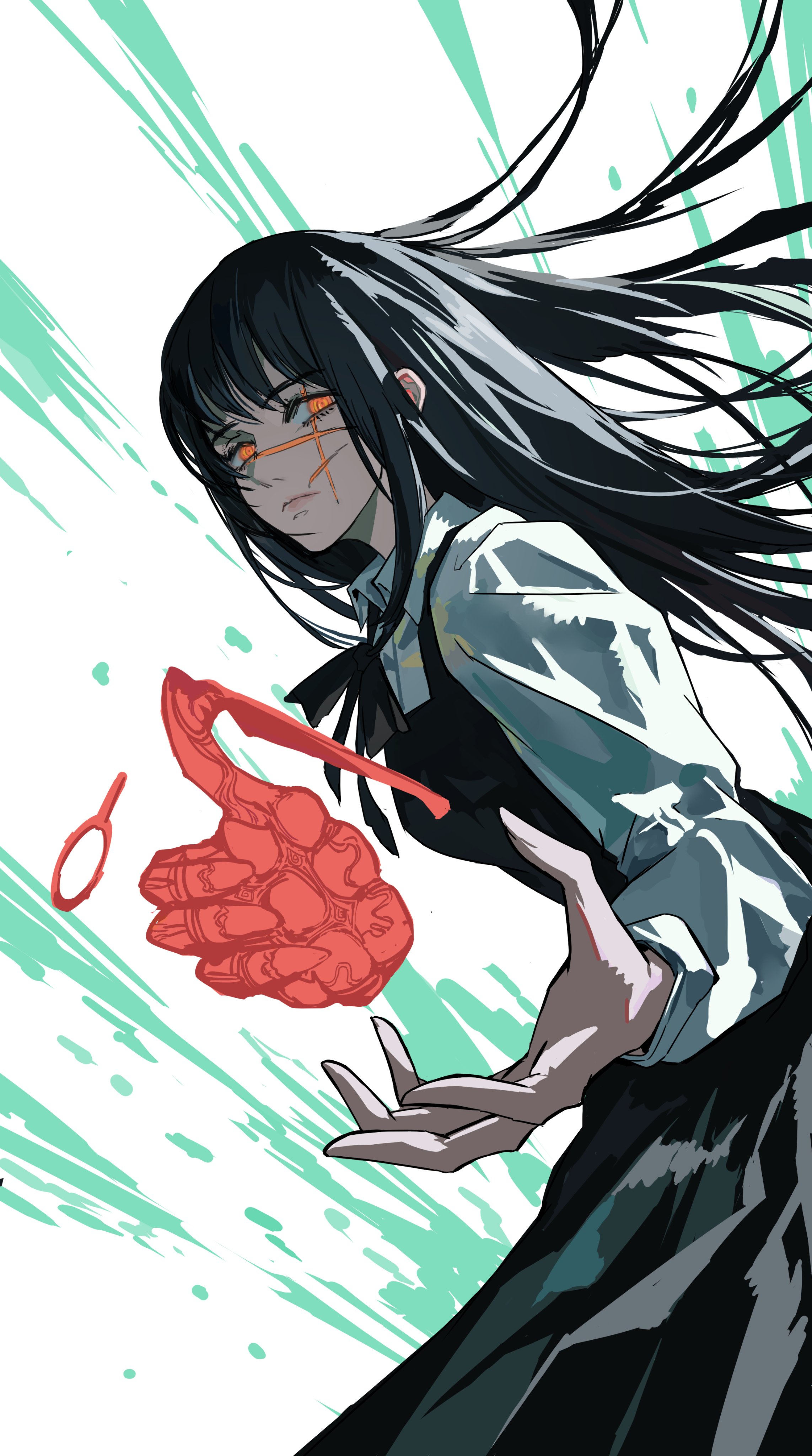 1girl absurdres black_hair blood blood_splatter breasts chainsaw_man dahe_z disembodied_hand explosive expressionless floating floating_object fourth_east_high_school_uniform glowing glowing_eyes grenade highres long_hair looking_at_viewer open_hand scar scar_on_face school_uniform shadow small_breasts splatter splatter_background thumbs_up white_background yoru_(chainsaw_man)