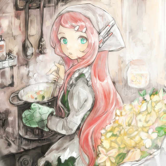 1girl apron bouquet commentary_request cooking cooking_pot dress flower food from_behind green_dress green_eyes hair_ornament hairclip headscarf holding holding_ladle indoors juliet_sleeves kedama_black kitchen ladle long_hair long_sleeves looking_at_viewer looking_back momone_momo oven_mitts pink_hair puffy_sleeves robot_ears solo soup soup_ladle steam stove swept_bangs tenugui utau utensil_rack wavy_hair white_apron white_headscarf white_sleeves