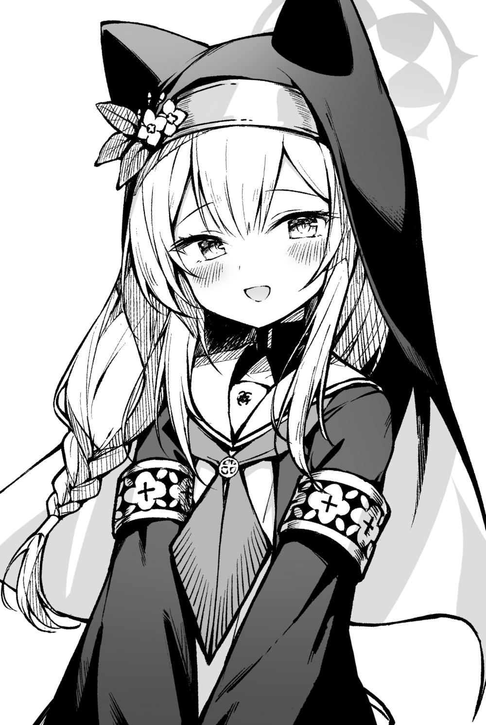1girl animal_ear_headwear blue_archive blush braid coif commentary_request fake_animal_ears flower grey_hair greyscale habit halo hat hat_flower highres long_hair long_sleeves mari_(blue_archive) monochrome neckerchief nun open_mouth sailor_collar simple_background single_braid smile solo topia upper_body white_background