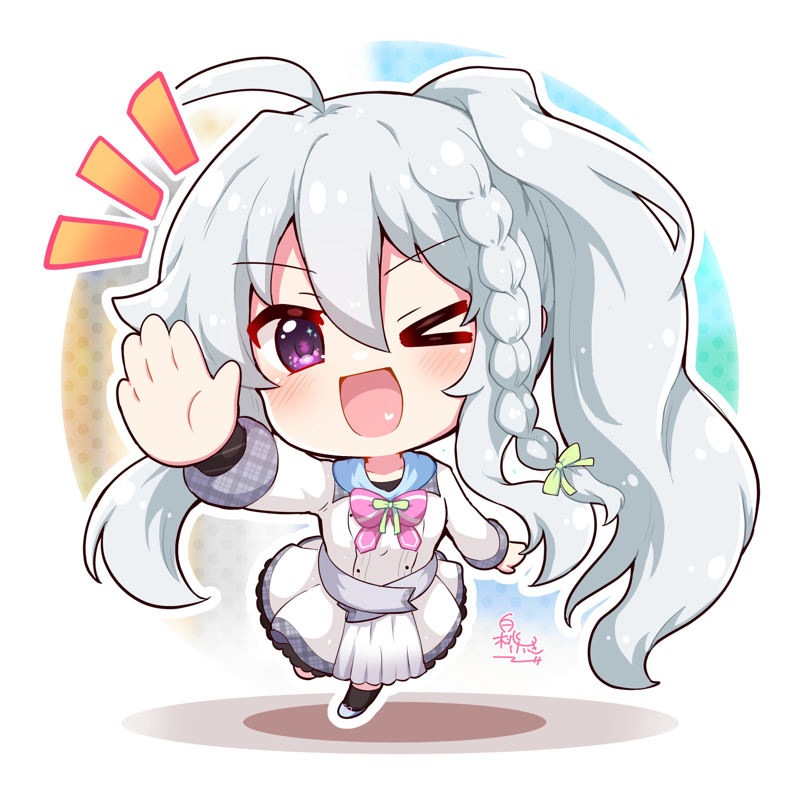 >_o 1girl 9-nine- ;d absurdres ahoge blush bow braid chibi commentary eyelashes frilled_skirt frills green_ribbon hair_between_eyes hair_ribbon hakutocake happy highres long_hair long_sleeves looking_at_viewer miniskirt neck_ribbon niimi_sora notice_lines one_eye_closed open_hand open_mouth pink_bow purple_eyes ribbon school_uniform shirt side_ponytail sidelocks signature simple_background single_braid skirt smile solo sparkling_eyes standing standing_on_one_leg waving wavy_hair white_background white_shirt white_skirt