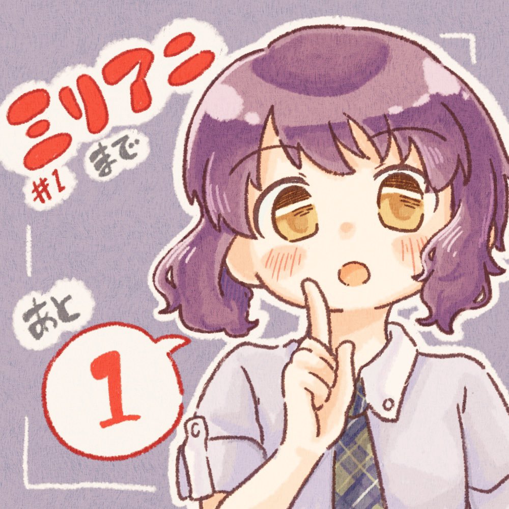 1girl 77haniwa :o blue_shirt blush checkered_necktie commentary countdown finger_counting hand_up idolmaster idolmaster_million_live! idolmaster_million_live!_(anime) index_finger_raised looking_at_viewer makabe_mizuki necktie purple_background purple_hair shirt short_hair short_sleeves sidelocks solo spoken_number upper_body wavy_hair wing_collar yellow_eyes