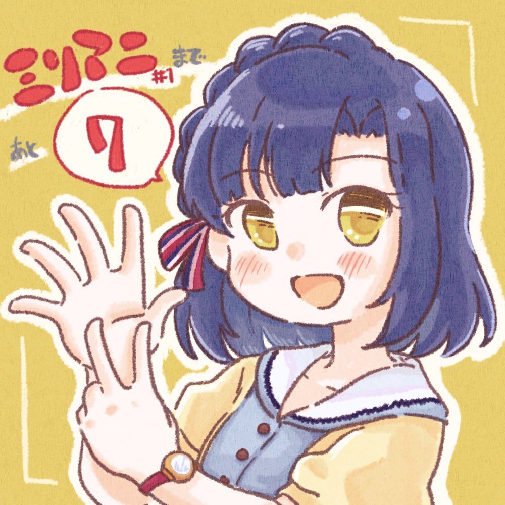 1girl 77haniwa blue_hair blue_shirt blush braid buttons cardigan commentary countdown finger_counting hair_ribbon hands_up idolmaster idolmaster_million_live! idolmaster_million_live!_(anime) looking_at_viewer medium_hair nanao_yuriko open_mouth red_ribbon ribbon sailor_collar shirt smile solo spoken_number v watch white_sailor_collar wristwatch yellow_background yellow_cardigan yellow_eyes