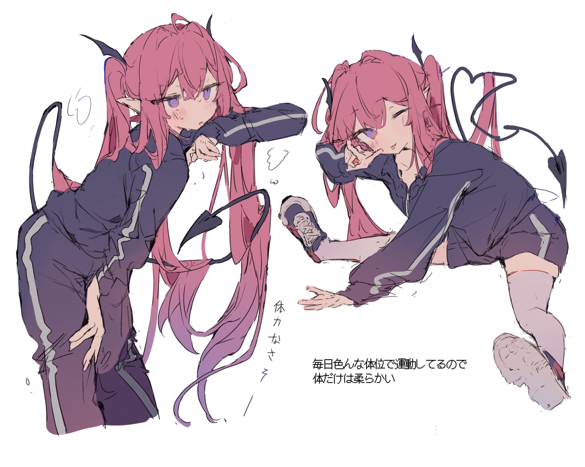 1girl bunchi highres long_hair multiple_views one_eye_closed original pink_hair pointy_ears school_uniform split tail thighhighs tongue tongue_out v very_long_hair white_thighhighs