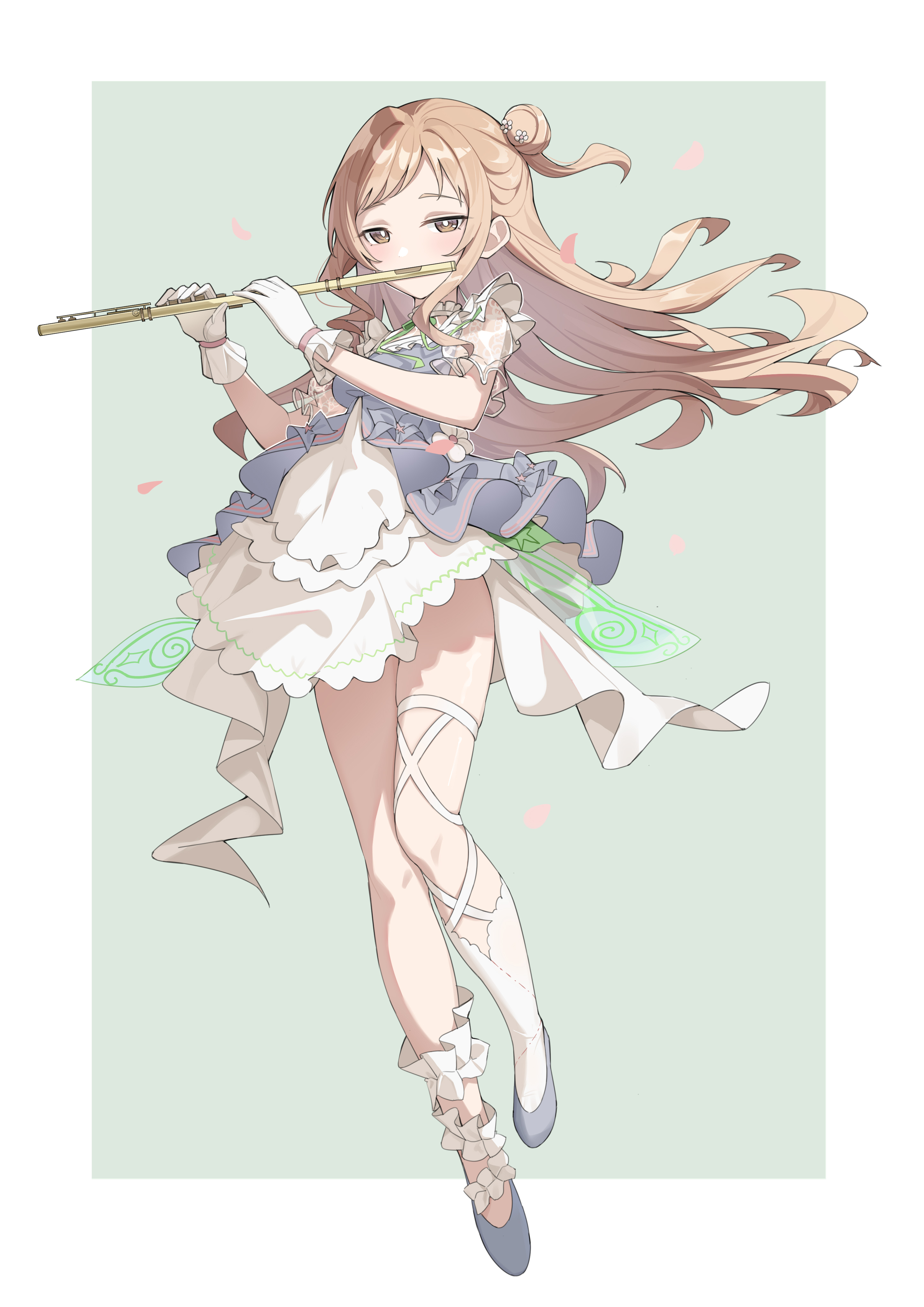 1girl absurdres asymmetrical_legwear blue_dress blue_footwear bright_pupils brown_eyes dress flute frilled_skirt frills gloves hair_bun highres holding holding_flute holding_instrument idolmaster idolmaster_shiny_colors instrument leg_ribbon light_brown_hair long_hair petals playing_flute playing_instrument ribbon sakuragi_mano single_side_bun skirt socks solo tamago_(eva1314056) transverse_flute white_dress white_gloves white_pupils