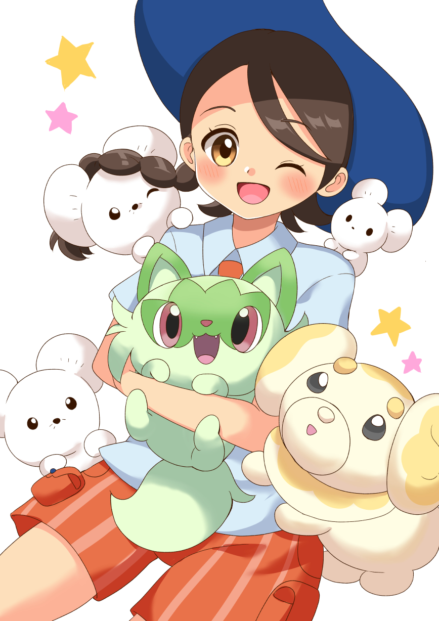 1girl alice_(pixiv80284903) blue_headwear brown_hair bush cat dog fidough hat highres juliana_(pokemon) mouse_(animal) naranja_academy_school_uniform necktie nintendo one_eye_closed open_mouth orange_shorts pokemon pokemon_(creature) pokemon_scarlet_and_violet school_uniform shorts simple_background sitting smile sprigatito star_(symbol) swept_bangs tandemaus white_background