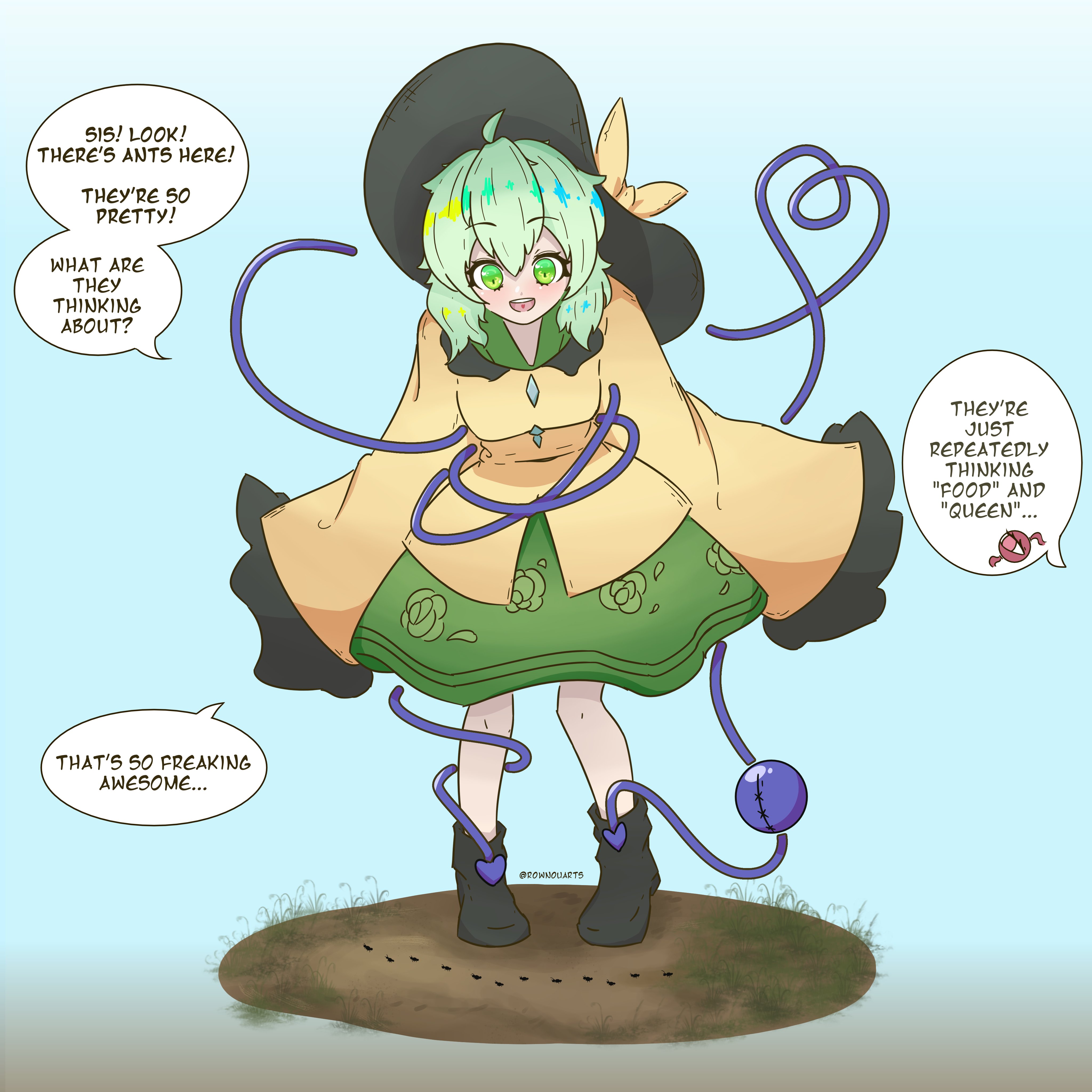 1girl absurdres ant black_footwear black_headwear bow bug english_text full_body green_eyes green_hair green_skirt hat hat_bow heart heart_of_string highres insect komeiji_koishi long_sleeves medium_hair open_mouth rownou shirt skirt speech_bubble standing third_eye touhou twitter_username yellow_bow yellow_shirt