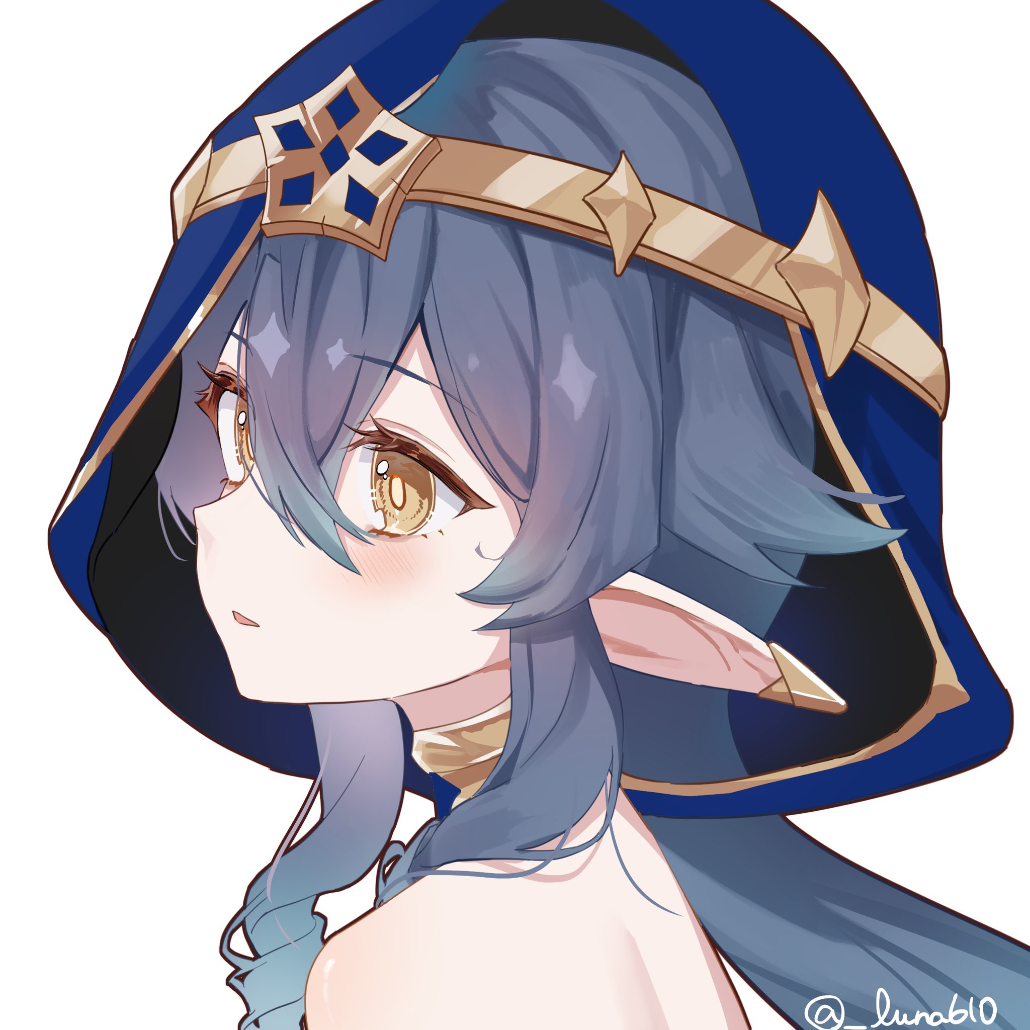1girl bare_shoulders blue_hair blue_hood blush close-up commentary drill_hair drill_sidelocks genshin_impact gold_trim hair_between_eyes highres hood layla_(genshin_impact) long_hair looking_ahead luna_(luna610) open_mouth pointy_ears ringlets sidelocks simple_background solo twitter_username upper_body white_background yellow_eyes