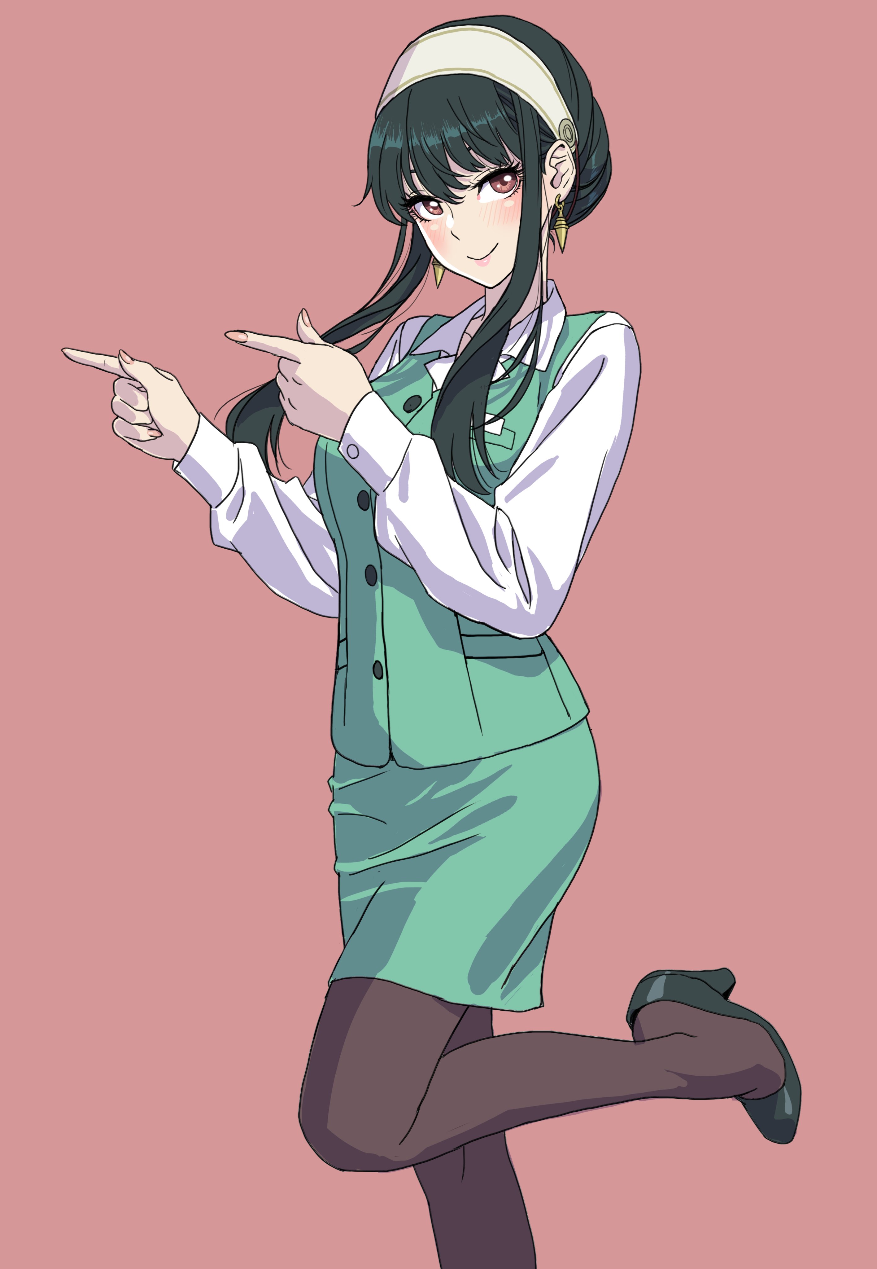 1girl absurdres black_footwear black_hair black_pantyhose blush breasts buttons closed_mouth collared_shirt commentary_request earrings fingernails green_skirt hairband hands_up high_heels highres index_finger_raised jewelry leg_up lips long_sleeves looking_at_viewer medium_breasts pantyhose pencil_skirt pink_background red_eyes shirt sidelocks simple_background skirt smile solo spy_x_family white_shirt yamashita_shun'ya yor_briar