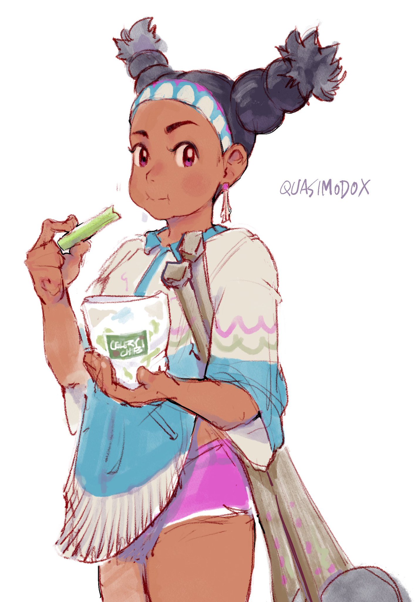 1girl artist_name black_hair dark-skinned_female dark_skin eating food highres lily_hawk medium_hair multi-tied_hair pink_shorts quasimodox short_shorts short_sleeves shorts simple_background street_fighter street_fighter_6 very_dark_skin white_background