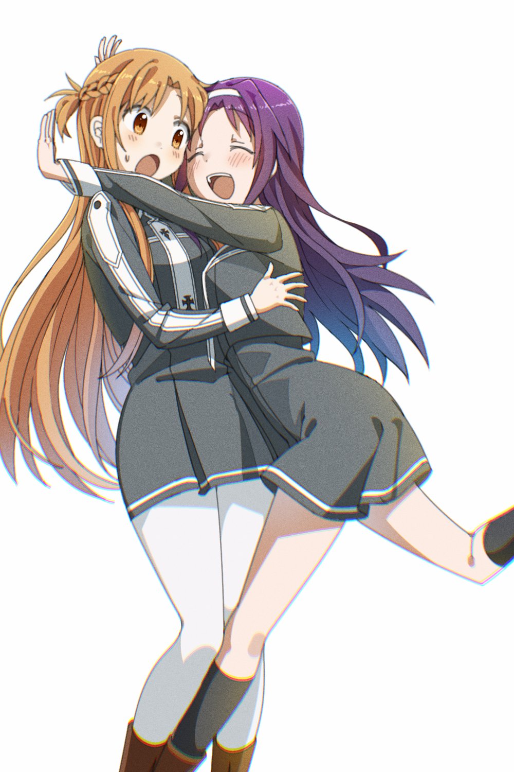 2girls asuna_(sao) black_socks blush braid brown_eyes brown_footwear brown_hair closed_eyes dress grey_dress grey_jacket grey_skirt hairband half_up_braid highres hug jacket leg_up long_sleeves multiple_girls open_mouth pantyhose purple_hair school_uniform skirt socks sweatdrop sword_art_online sword_mastery_academy_school_uniform teeth upper_teeth_only white_background white_hairband white_pantyhose wqn0930 yuri yuuki_(sao)