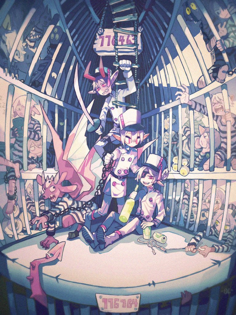 >_< 4boys black_nails boots bottle buttons can chain chinese_commentary clenched_teeth coat collared_coat commentary_request cuffs cutlass drink_can duantouhongmo extra_eyes eyepatch gloves half-closed_eyes hand_on_own_head hat high_collar holding holding_bottle holding_chain holding_sword holding_weapon horns key keyring knee_boots ladder long_sleeves monster multiple_boys nail_polish one-eyed open_mouth original outstretched_arm pants people pointy_ears prison prison_clothes prisoner red_eyes red_horns shackles sharp_teeth short_hair sign sitting smile soda_can spread_wings striped sword teeth third_eye upper_teeth_only weapon white_coat white_footwear white_gloves white_hair white_headwear white_pants yellow_horns