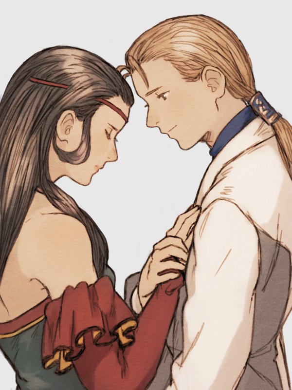 1boy 1girl bare_shoulders black_hair brown_hair circlet closed_mouth dress gensou_suikoden gensou_suikoden_ii jillia_blight jowy_atreides-blight long_hair maeka_(kumaekake) ponytail simple_background smile white_background