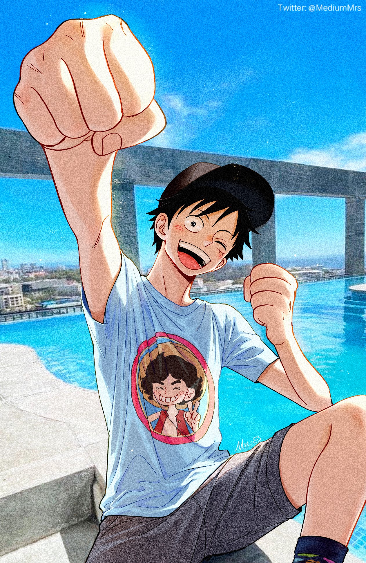 1boy alternate_costume artist_name baseball_cap black_hair black_hat blush clenched_hands commentary english_commentary facial_scar hat highres male_focus monkey_d._luffy mrs.custard one_eye_closed one_piece open_mouth outdoors photo_background scar scar_on_cheek scar_on_face short_hair signature sitting smile solo teeth