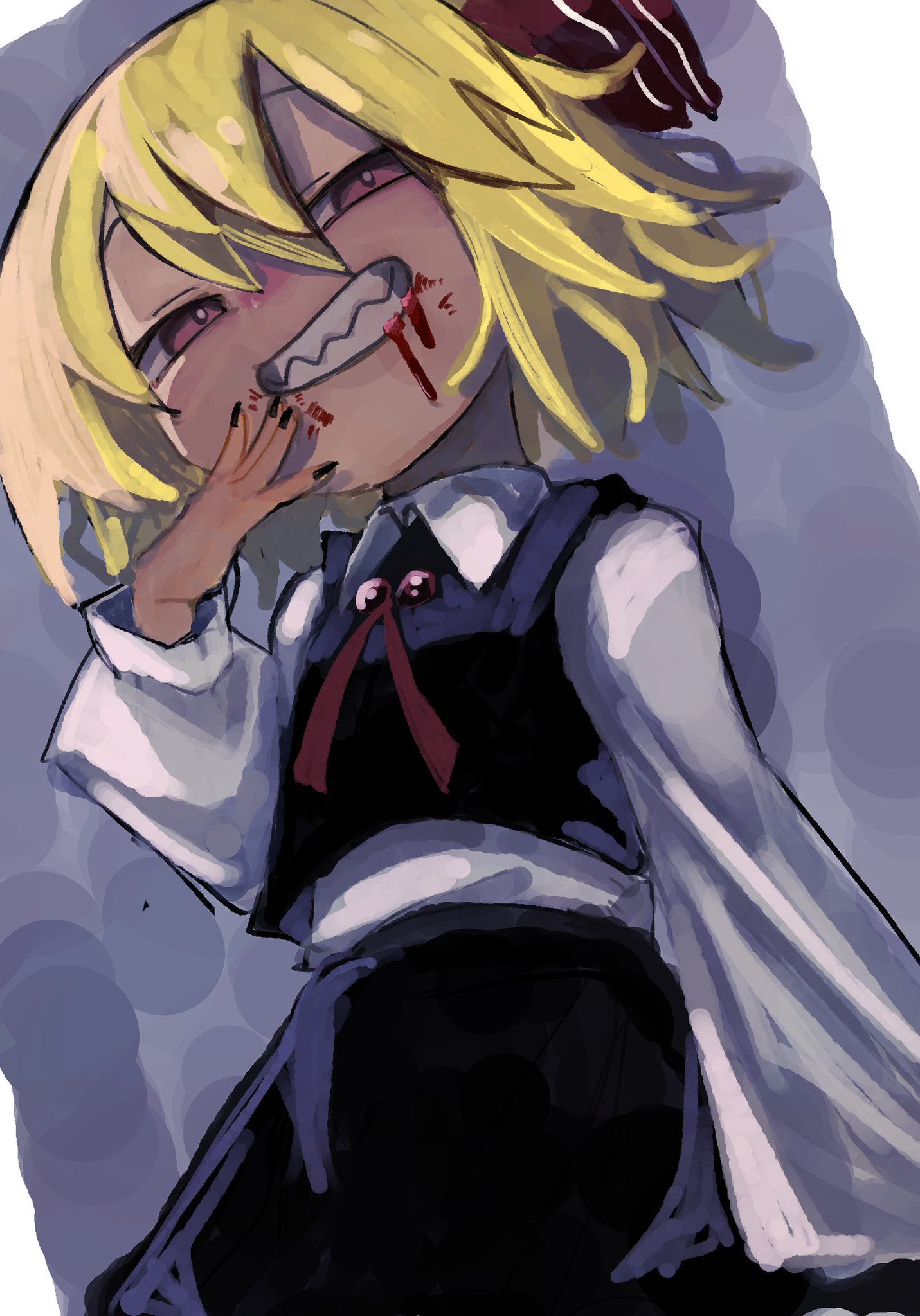 1girl blonde_hair grin hair_ribbon highres red_eyes ribbon rumia sharp_teeth shikemoku short_hair smile solo teeth touhou yellow_ribbon ||/