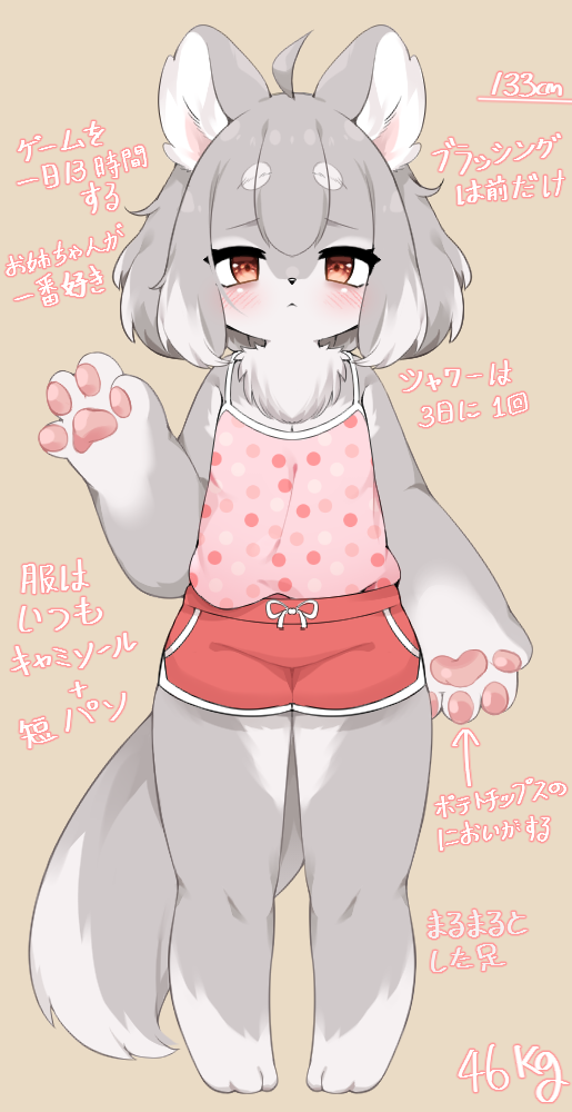 1girl :< ahoge animal_ear_fluff animal_ears animal_hands arm_up barefoot blush brown_eyes camisole full_body furry furry_female grey_hair ichi_(nuksun12) original pink_camisole red_shorts short_hair short_shorts shorts simple_background solo tail thighs translated wolf_ears wolf_girl wolf_tail